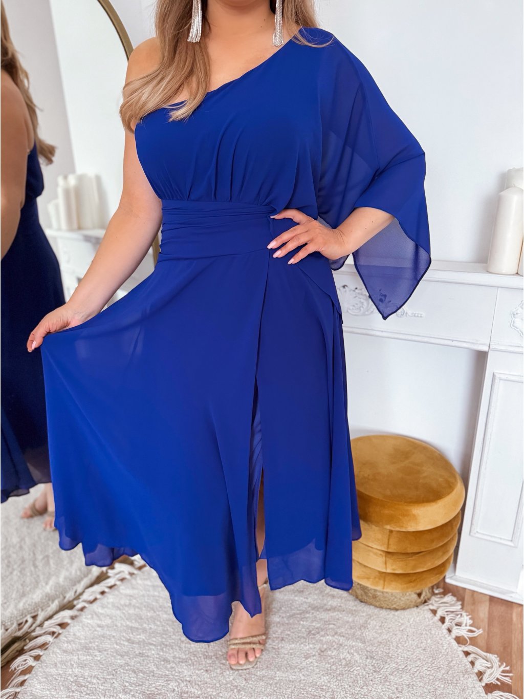 Az elegáns alkalmi ruha enyhén rugalmas anyagból készült, oldalsó cipzárral, finom mellkiemeléssel és szoknyarészén sliccel rendelkezik. A modell 168 cm magas és XXL méretet visel.
