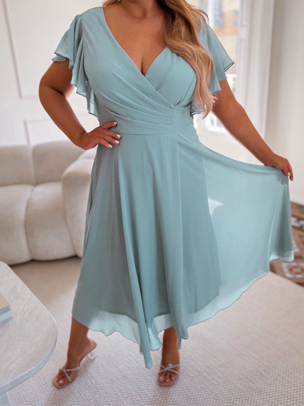 Az elegáns menta színű molett báli ruha enyhén rugalmas anyagból készült, hátul cipzárral és finom mellkiemeléssel rendelkezik. A modell 168 cm magas és 2XL-es méretet visel.