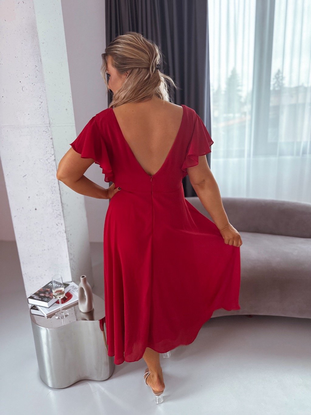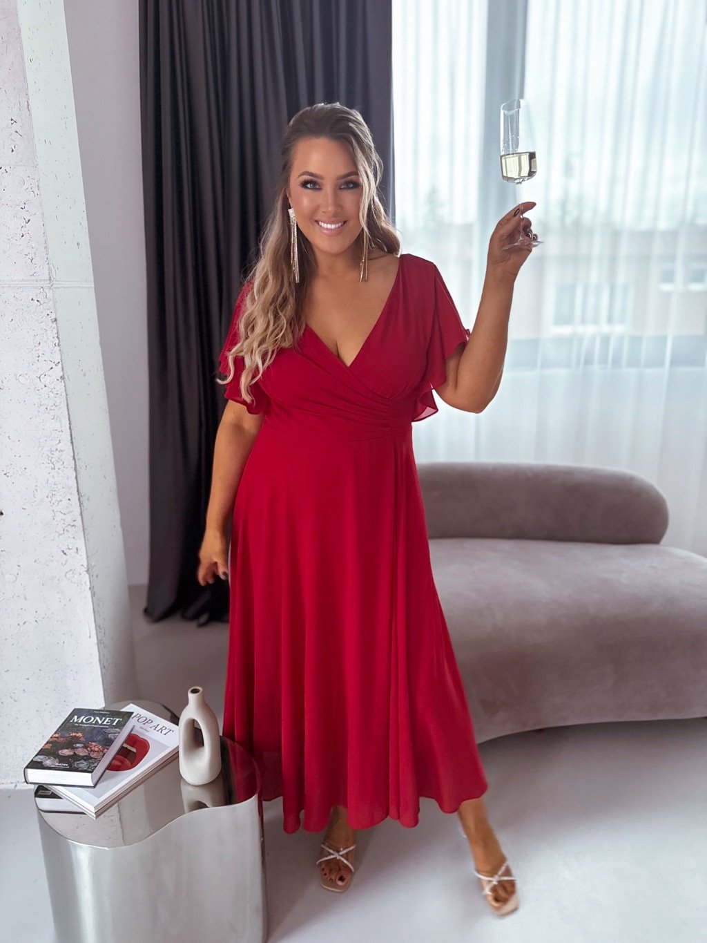 Az elegáns piros alkalmi ruha moletteknek enyhén rugalmas anyagból készült, hátul cipzárral és finom mellkiemeléssel rendelkezik. A modell 168 cm magas és XXL méretet visel.