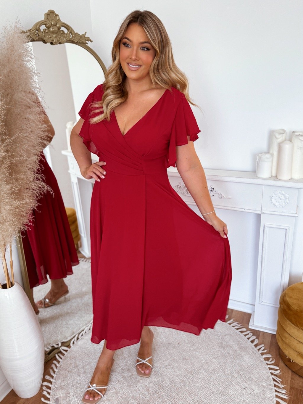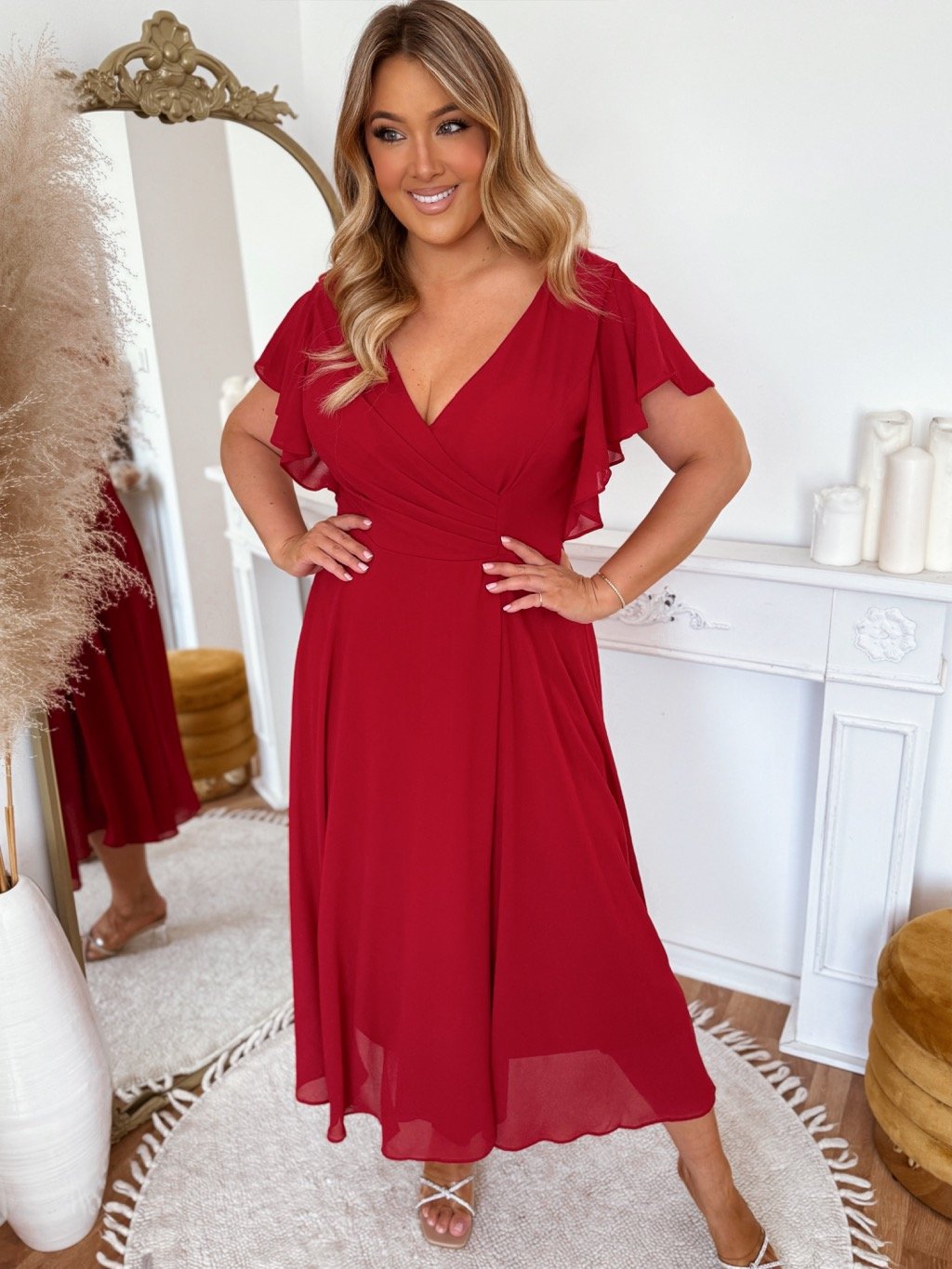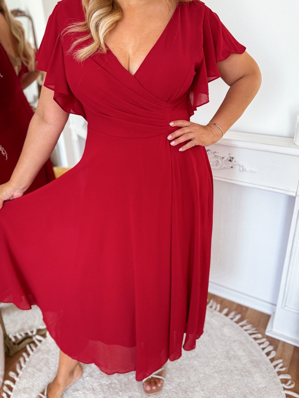 Az elegáns piros alkalmi ruha moletteknek enyhén rugalmas anyagból készült, hátul cipzárral és finom mellkiemeléssel rendelkezik. A modell 168 cm magas és XXL méretet visel.