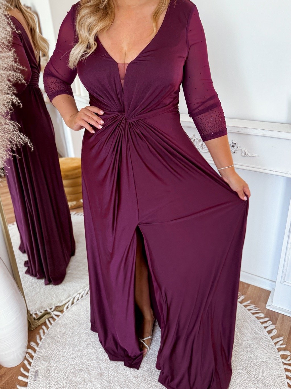 Elegáns estélyi ruha moletteknek mély kivágással, nagyon rugalmas anyagból készült, cipzárral a hátán és finom mellkiemeléssel. Az ujjak átlátszóak, kövekkel díszítettek. A modell 168 cm magas és XXL méretet visel.