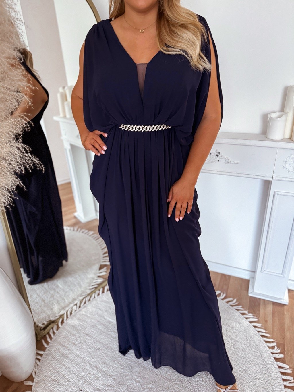 Sötétkék maxi ruha bevarrt övvel a deréknál gyönyörűen formálja az alakot és elegáns megjelenést kölcsönöz. A ruha hátul cipzárral záródik, a mellrészen finom, formázott merevítőkkel. A könnyű, esésű anyag és a bő szabás garantálja a kényelmet az egész társasági esemény alatt. Tökéletes választás esküvőkre, bálokra vagy ünnepségekre. A model mér 168 cm, és XL-es méretet visel.