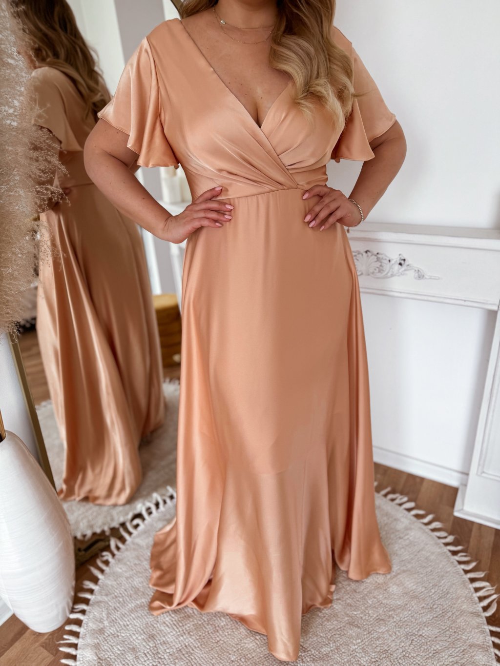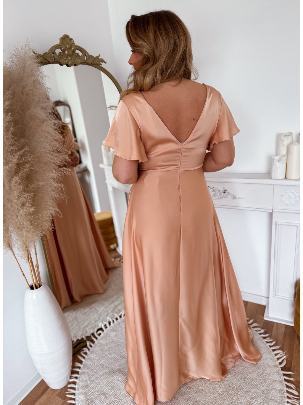 Elegáns szatén estélyi ruha barack-testszínű árnyalatban