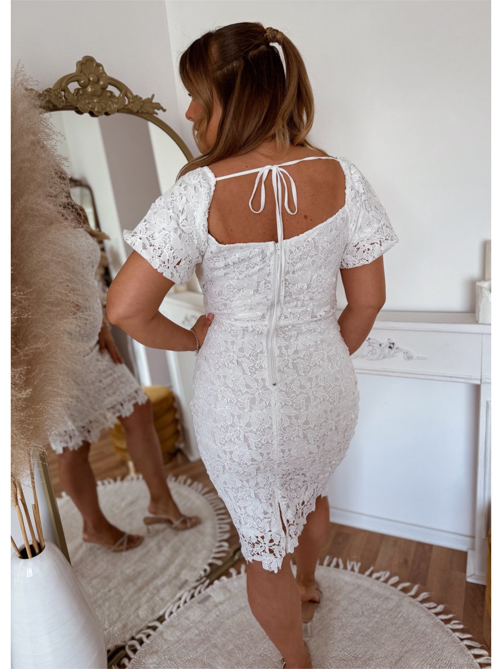 Az elegáns, testhezálló, fehér csipkés ruha hátul cipzárral záródik, a ruha enyhén rugalmas. A model mér 168 cm, és XL-es méretet visel.