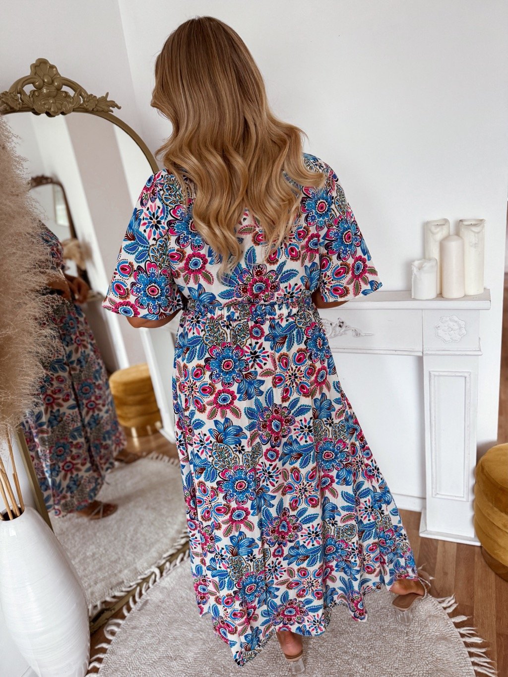 Elegáns, színes mintás, V-nyakú, karcsúsított sziluettet kiemelő övvel ellátott hosszú ruha. Ideális ünnepségekre, esküvőkre és különleges alkalmakra. A ruha derekán gumírozás található. A model mér 168 cm, és XL-es méretet visel.