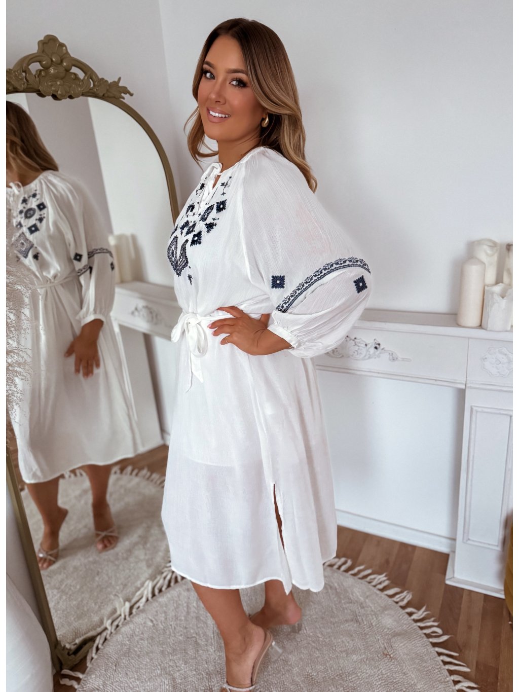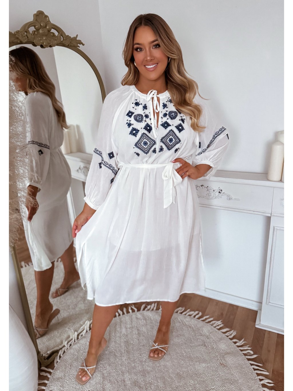 A fehér ruha laza szabású, és a derékban övvel szűkíthető. A modell 168 cm magas és L/XL méretet visel.