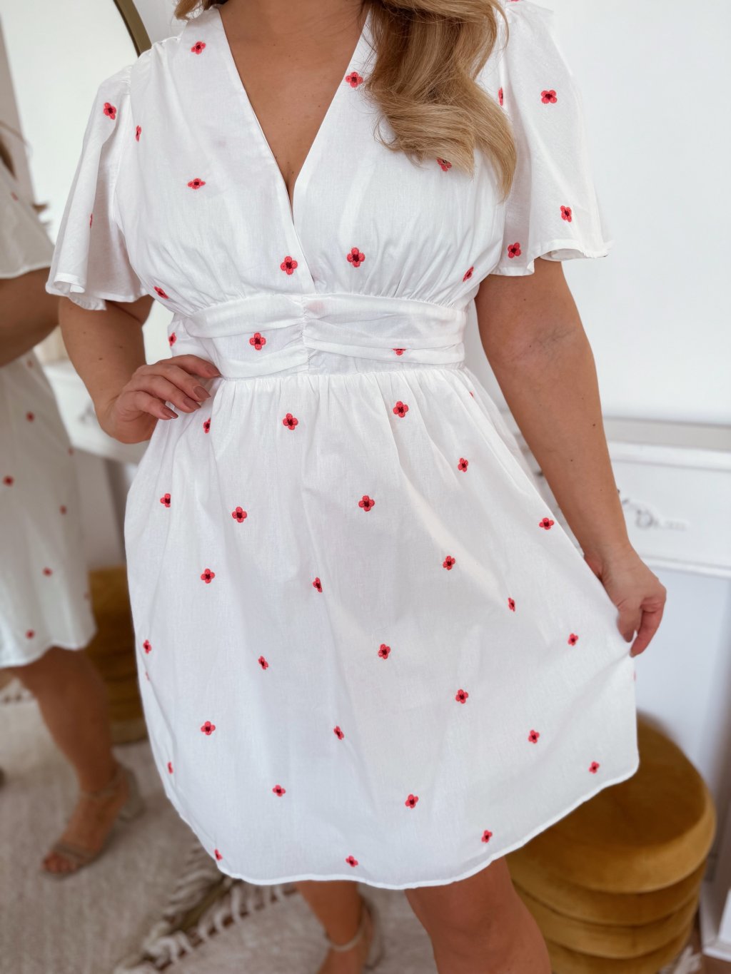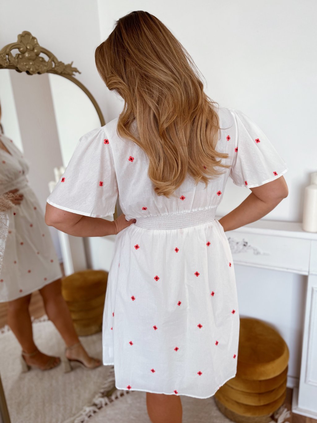 Rövid nyári pamut plus size ruha rövid ujjú és hímzett piros virágokkal, a ruha enyhén rugalmas és gumis a derekán. A model mér 168 cm, és XL-es méretet visel.