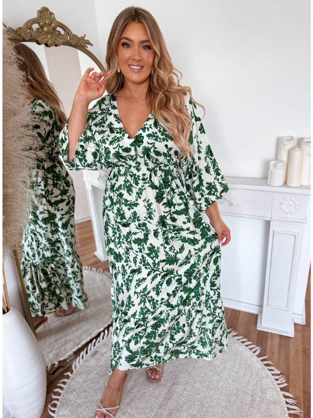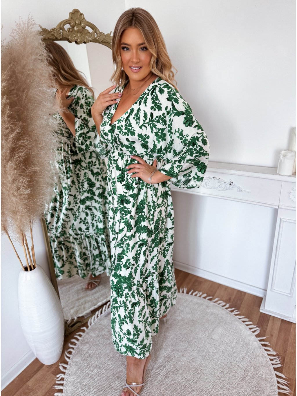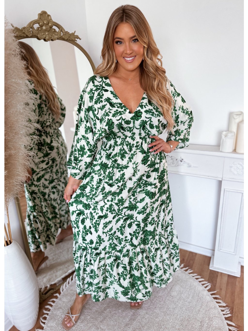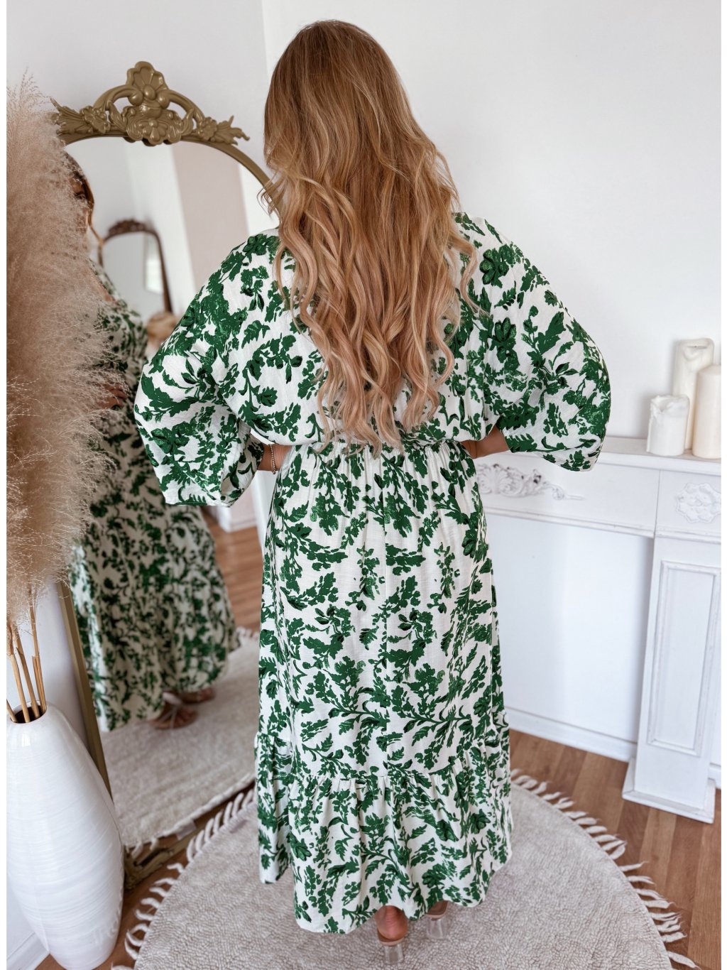 Fehér-zöld maxi ruha levélmintával