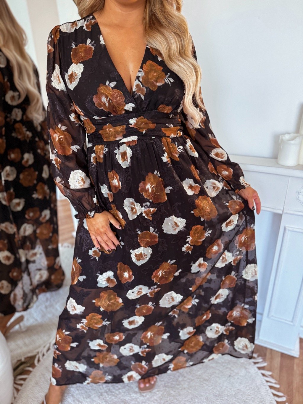 Ez az elegáns, fekete, virágmintás maxi ruha ideális választás társasági eseményekre, ünnepekre és romantikus vacsorákra egyaránt. A mély V-kivágás és az összehúzott, gumis derékrész gyönyörűen formálja az alakot, míg a hosszú ujjak finom eleganciát kölcsönöznek a ruhának. A könnyű, esése anyag kellemes viseletet biztosít, nőies, bájos megjelenést kölcsönöz. A model mér 168 cm, és XL-es méretet visel.