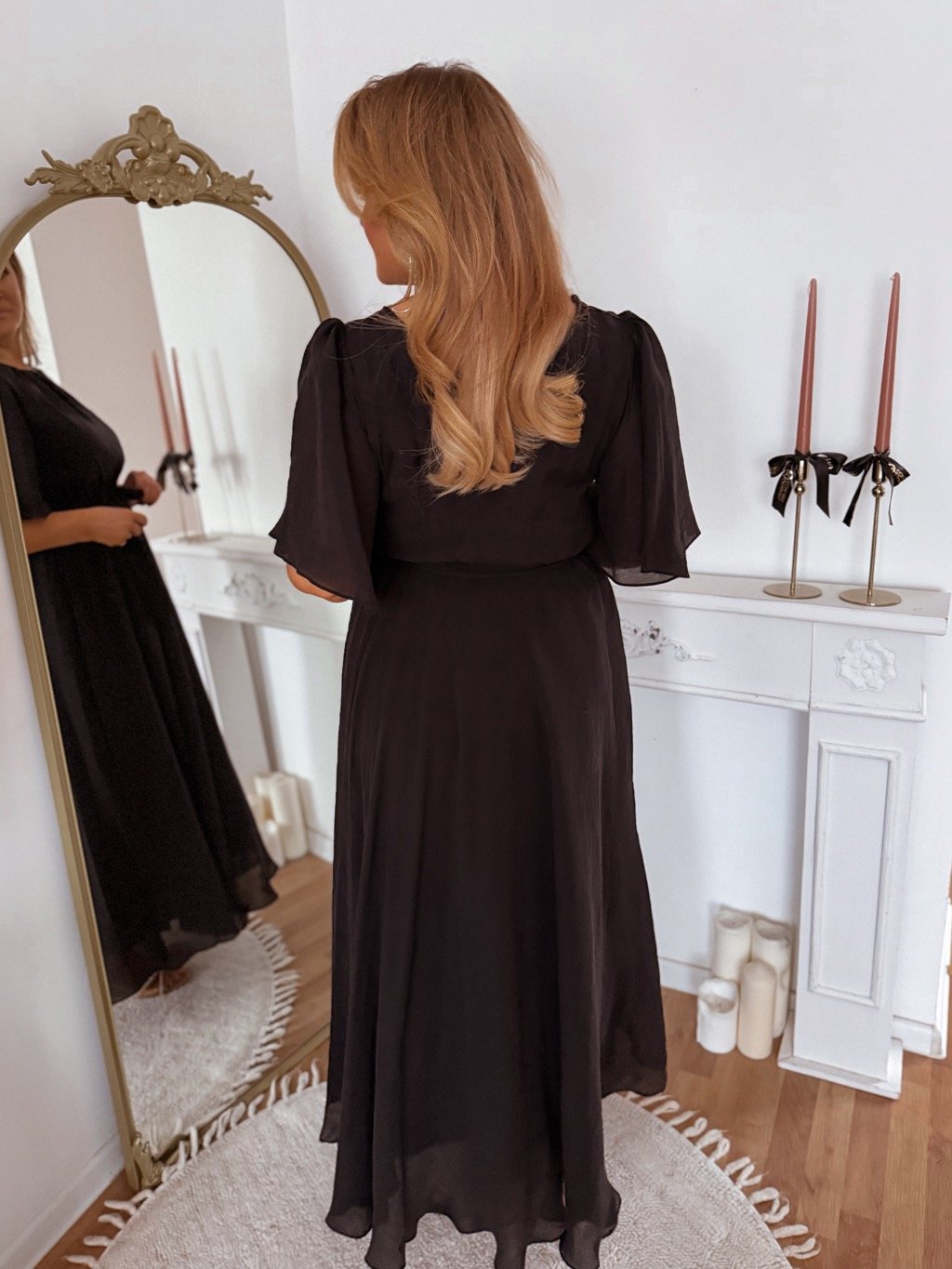 A hosszú, fekete, rövid ujjú ruha derekánál övvel összehúzható, az oldalán bő szabású. A derékrész gumírozott. A modell 168 cm magas és XL (42) méretet visel.