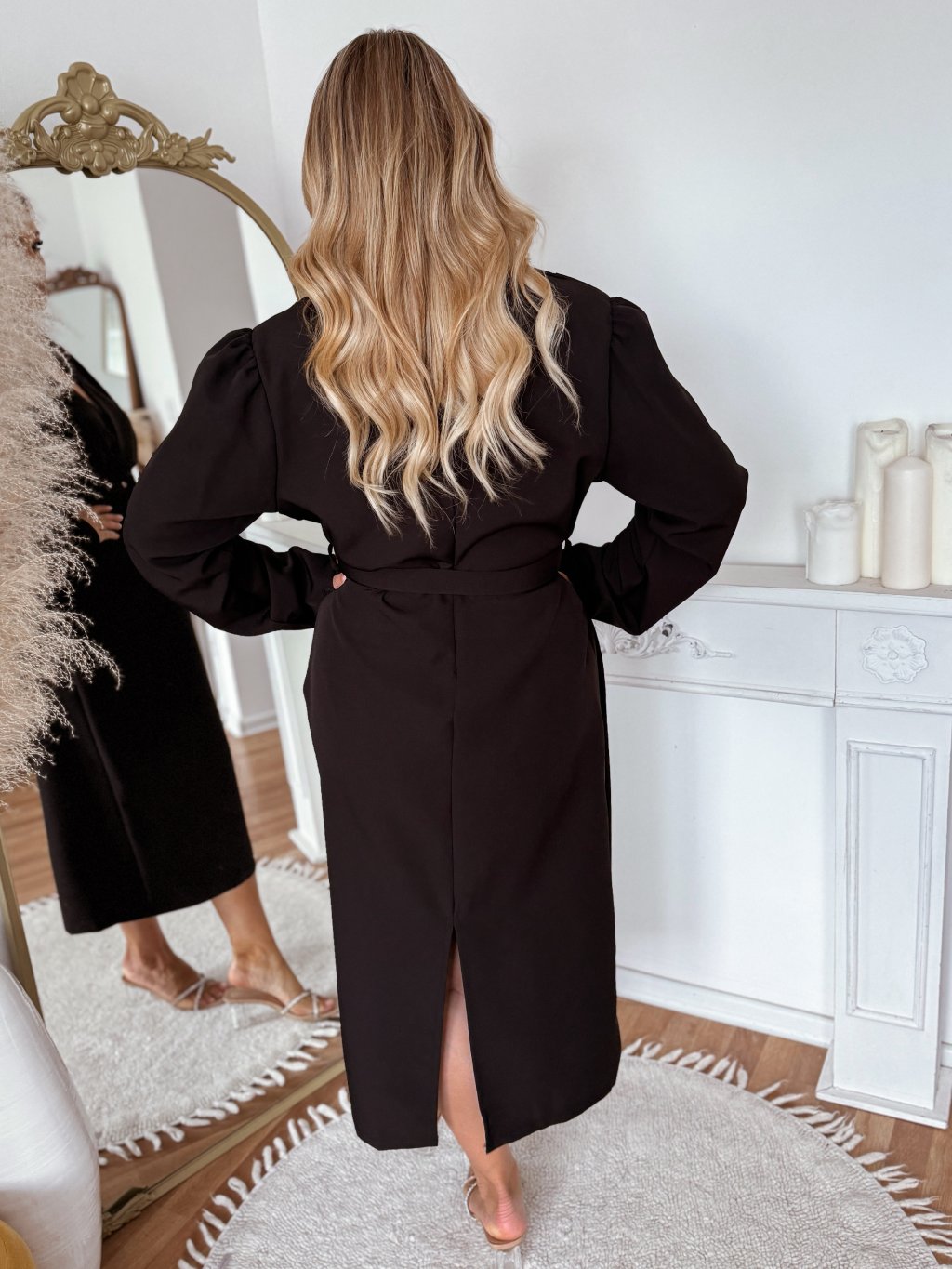 Fekete midi ruha övvel és hosszú ujjakkal