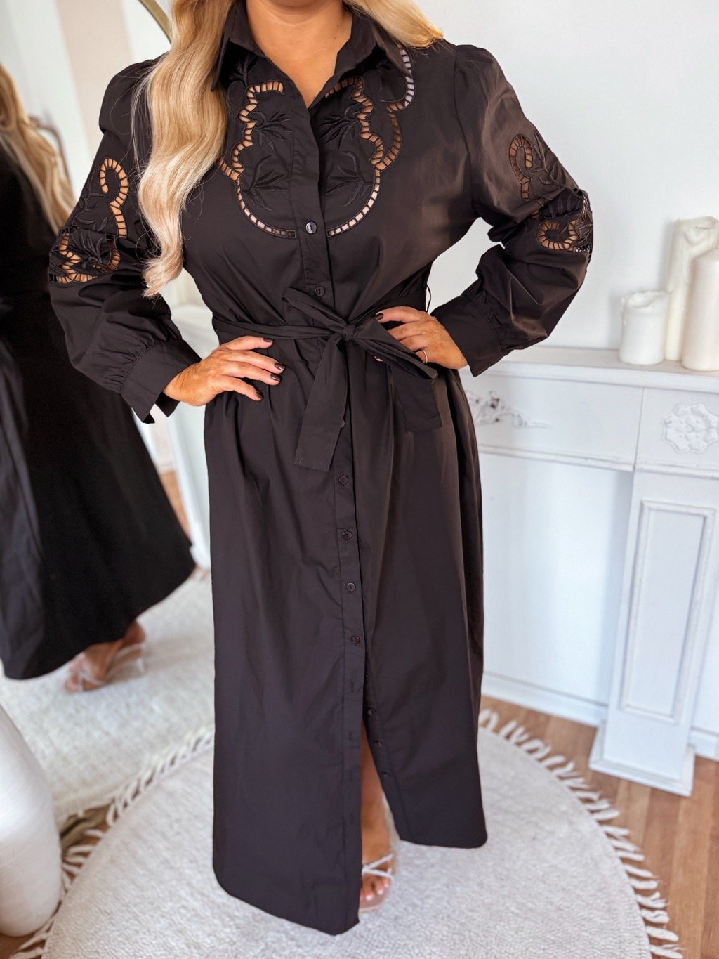 A pamut ingruhák laza szabásúak, az övvel a derékban szűkíthetők. A válltól lefelé a ruha teljesen bő. Ez az anyag nem rugalmas. A model mér 168 cm, és XL-es méretet visel.