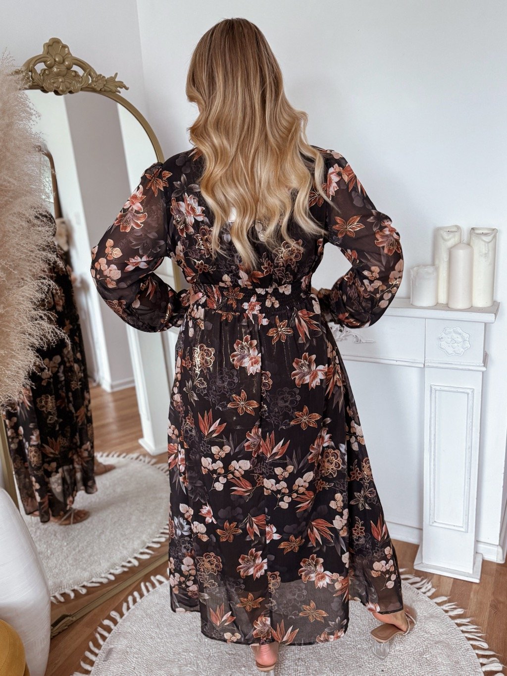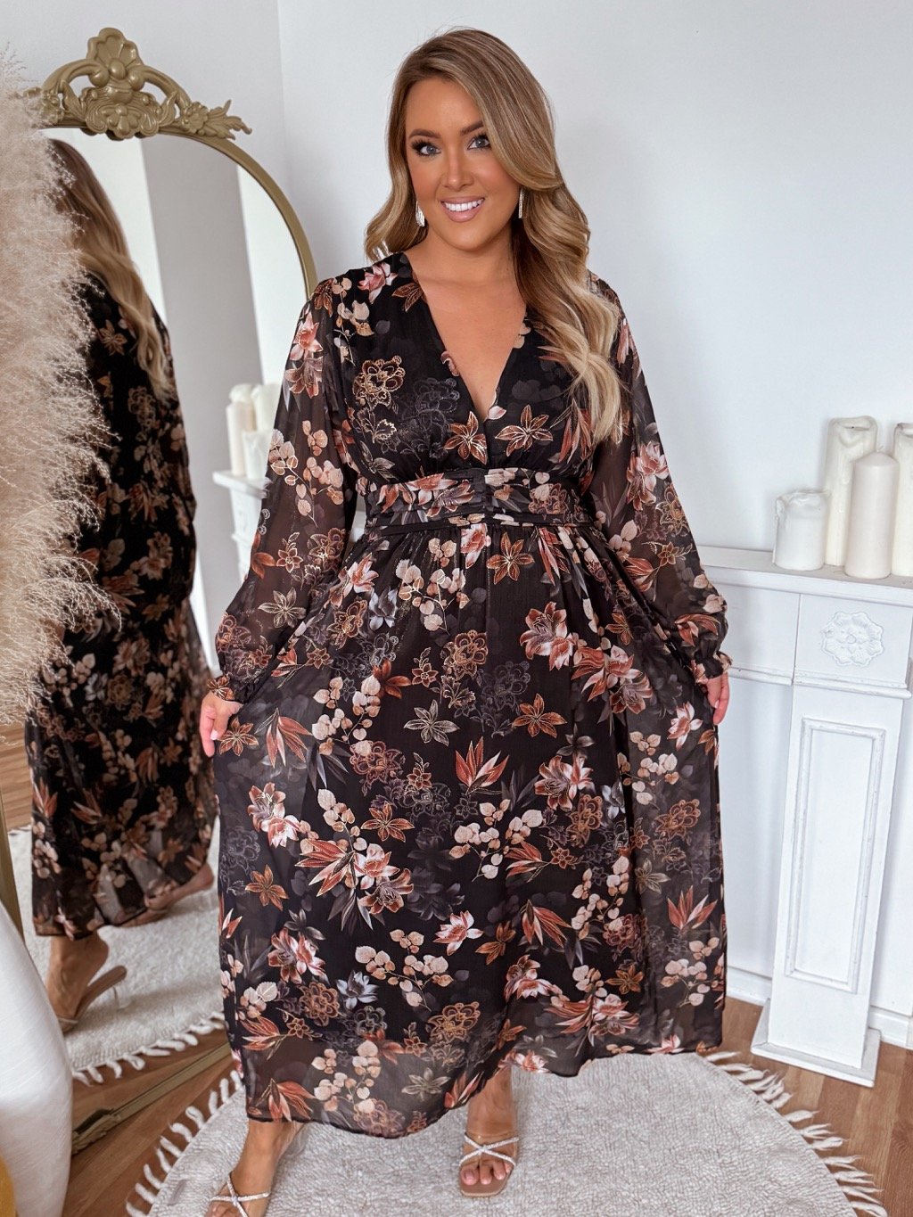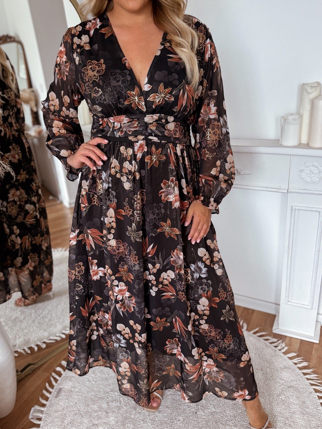 Hosszú virágos, ünnepi ruha moletteknek, hosszú ujjal és kivágással, a ruha derekában található gumis pánt gyönyörűen formálja az alakot. A model mér 168 cm, és XL-es méretet visel.