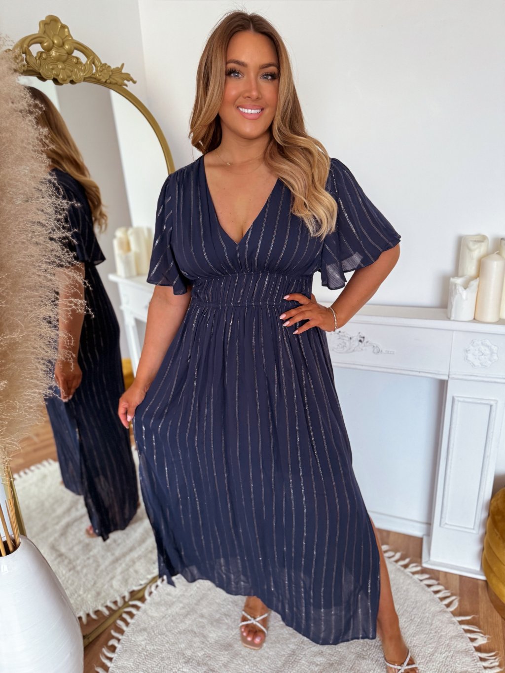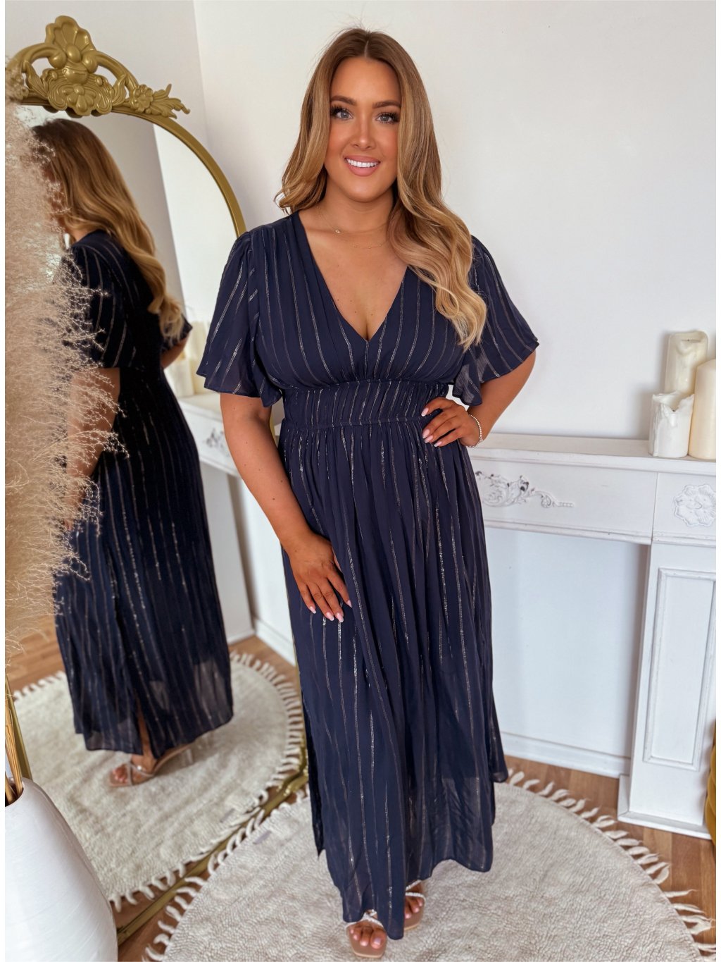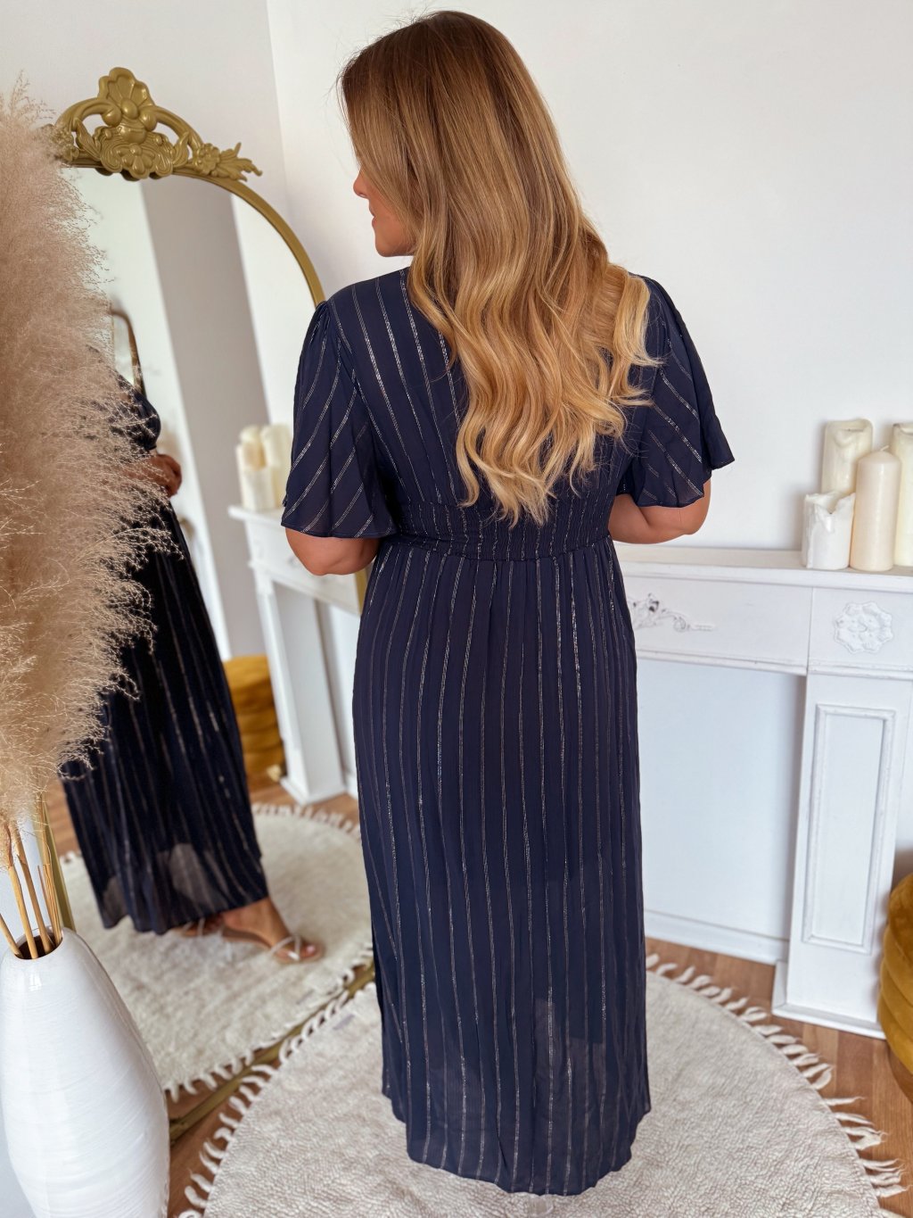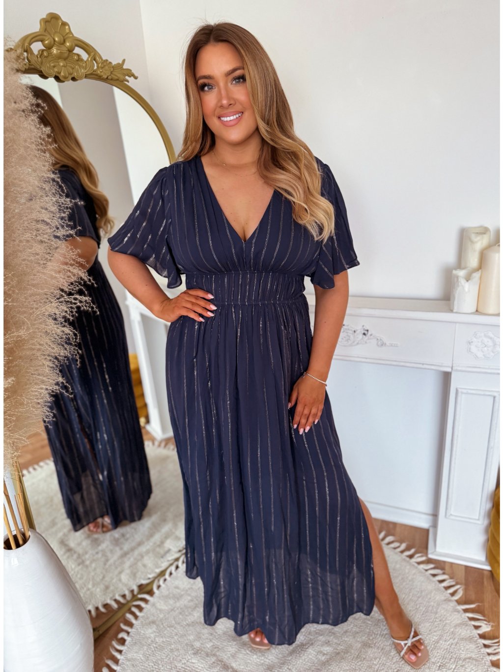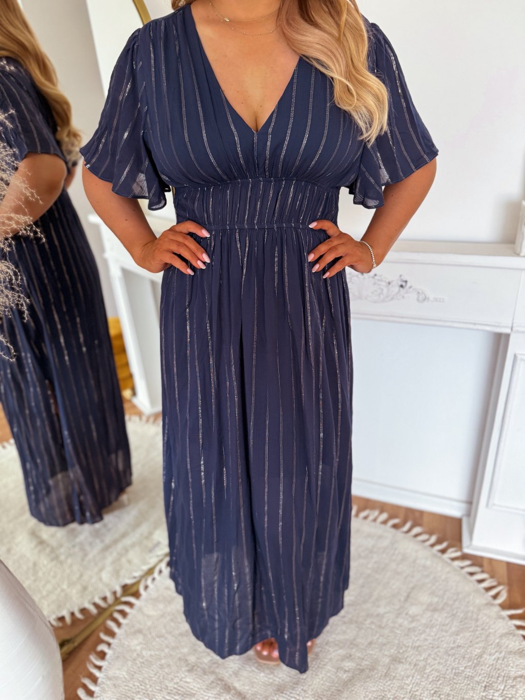 Hosszú nagyméretű ruha rövid ujjal, gumis derékkal, lazább szabással és oldalsó hasítékkal. A model mér 168 cm, és XL-es méretet visel.