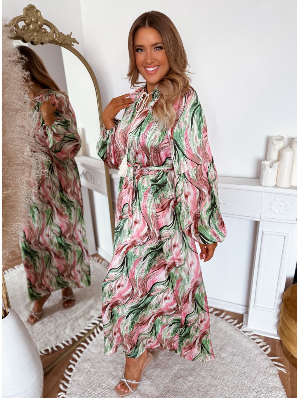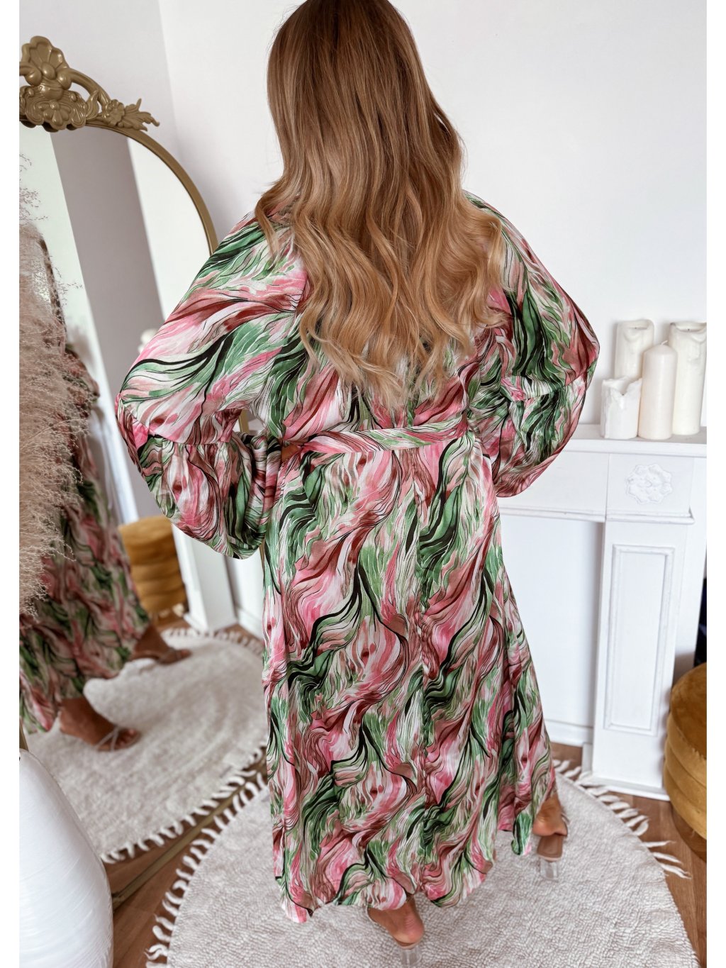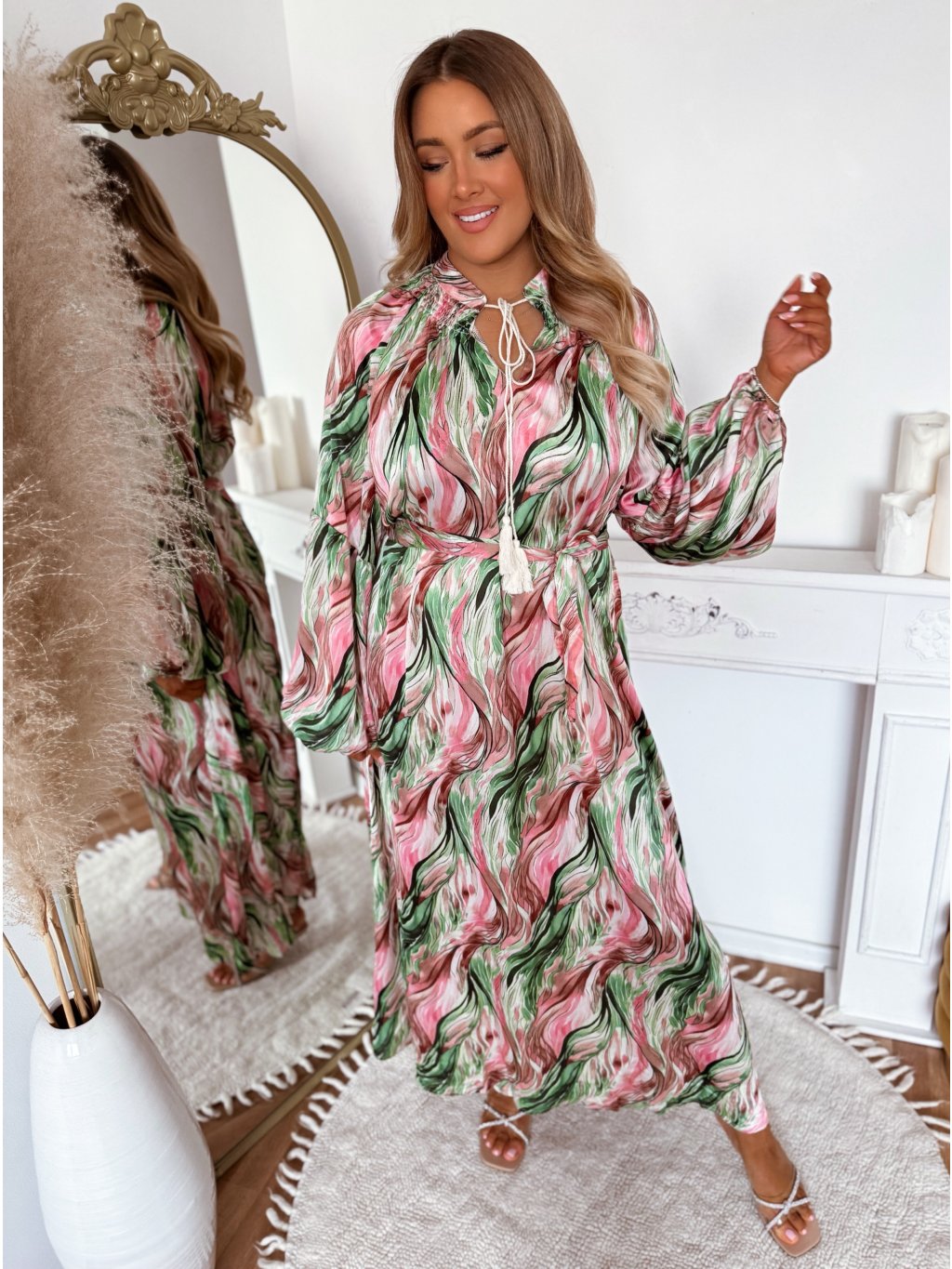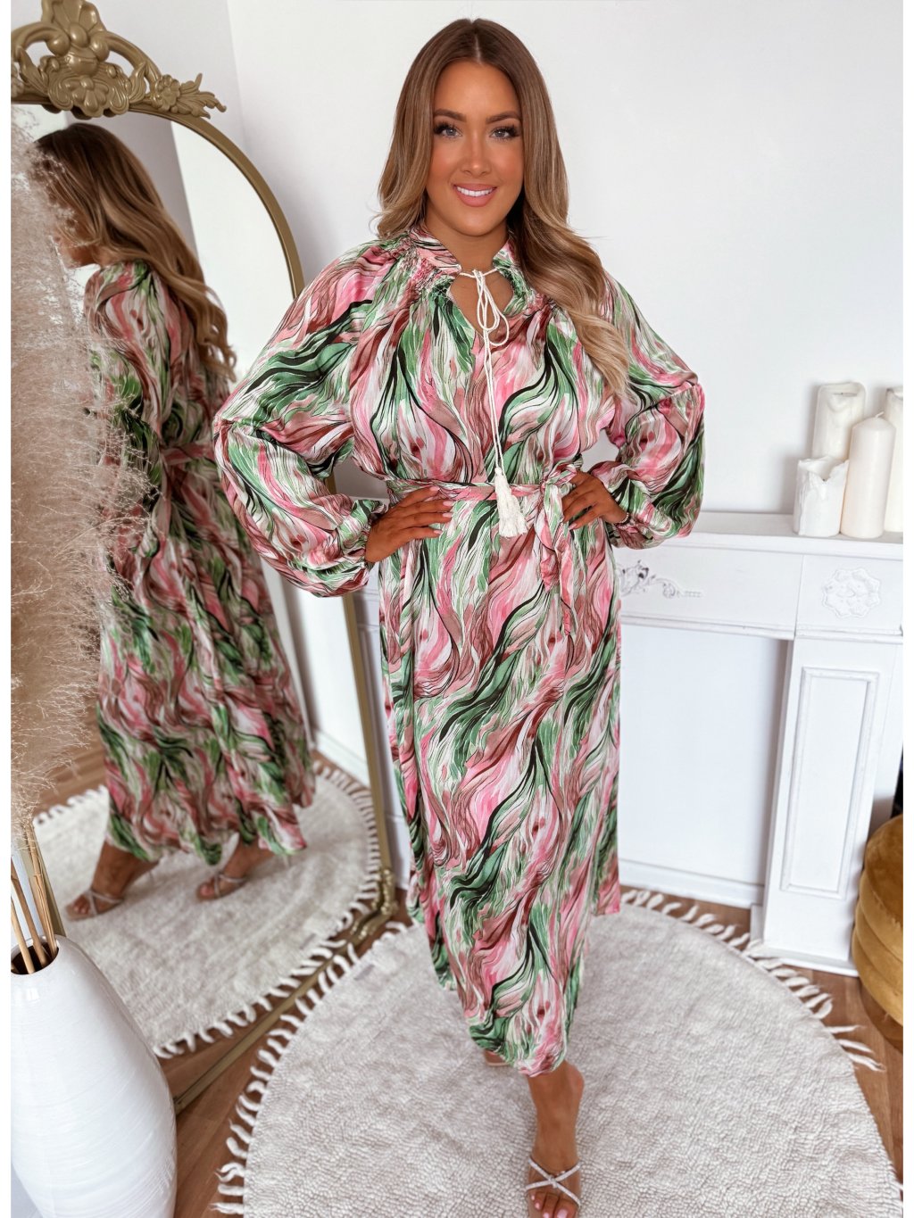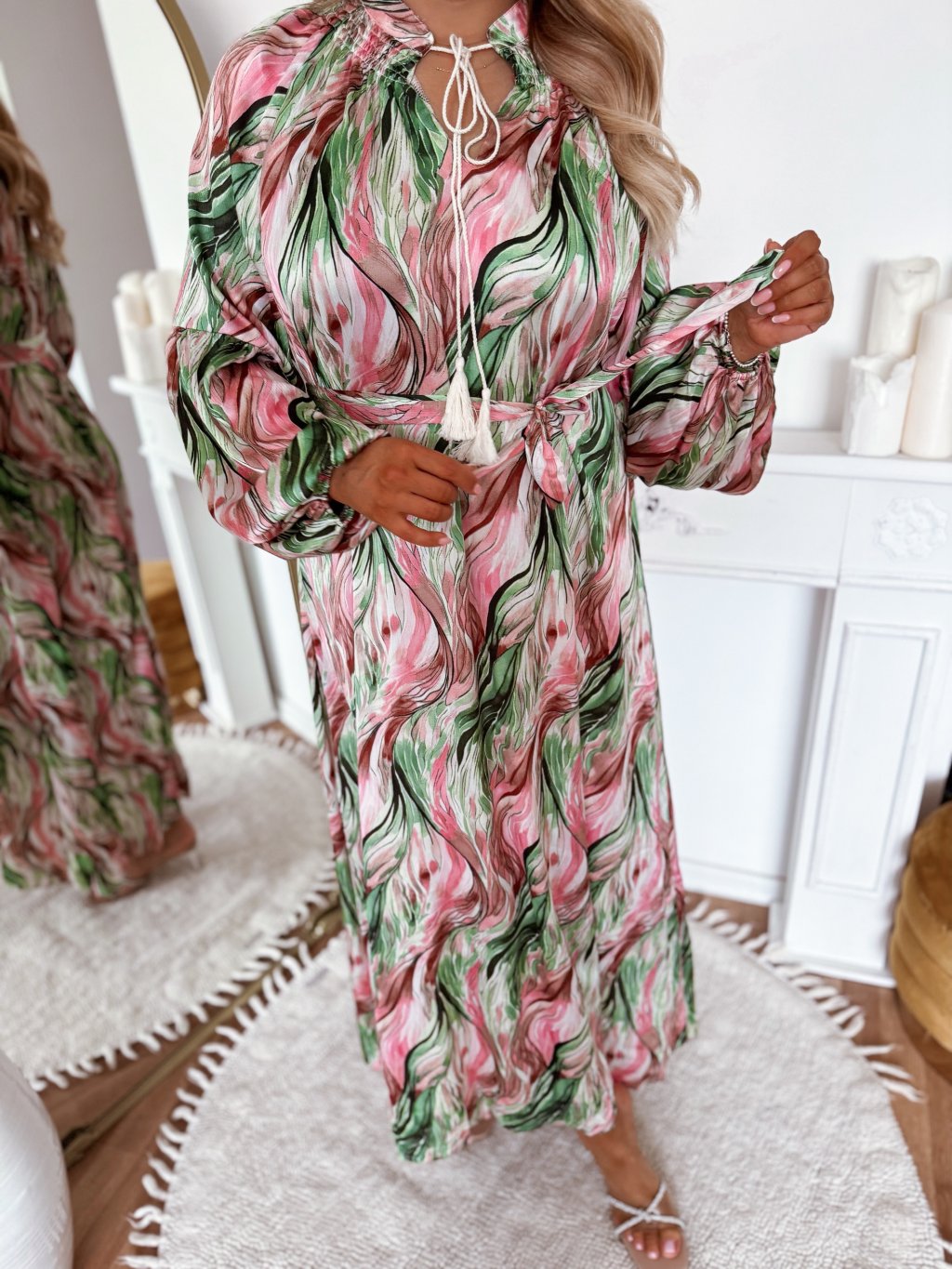 Az elegáns, színes maxiruhák teljesen laza szabásúak, és az övvel a deréknál szűkíthetők. A modell 168 cm magas és XL/XXL méretet visel.