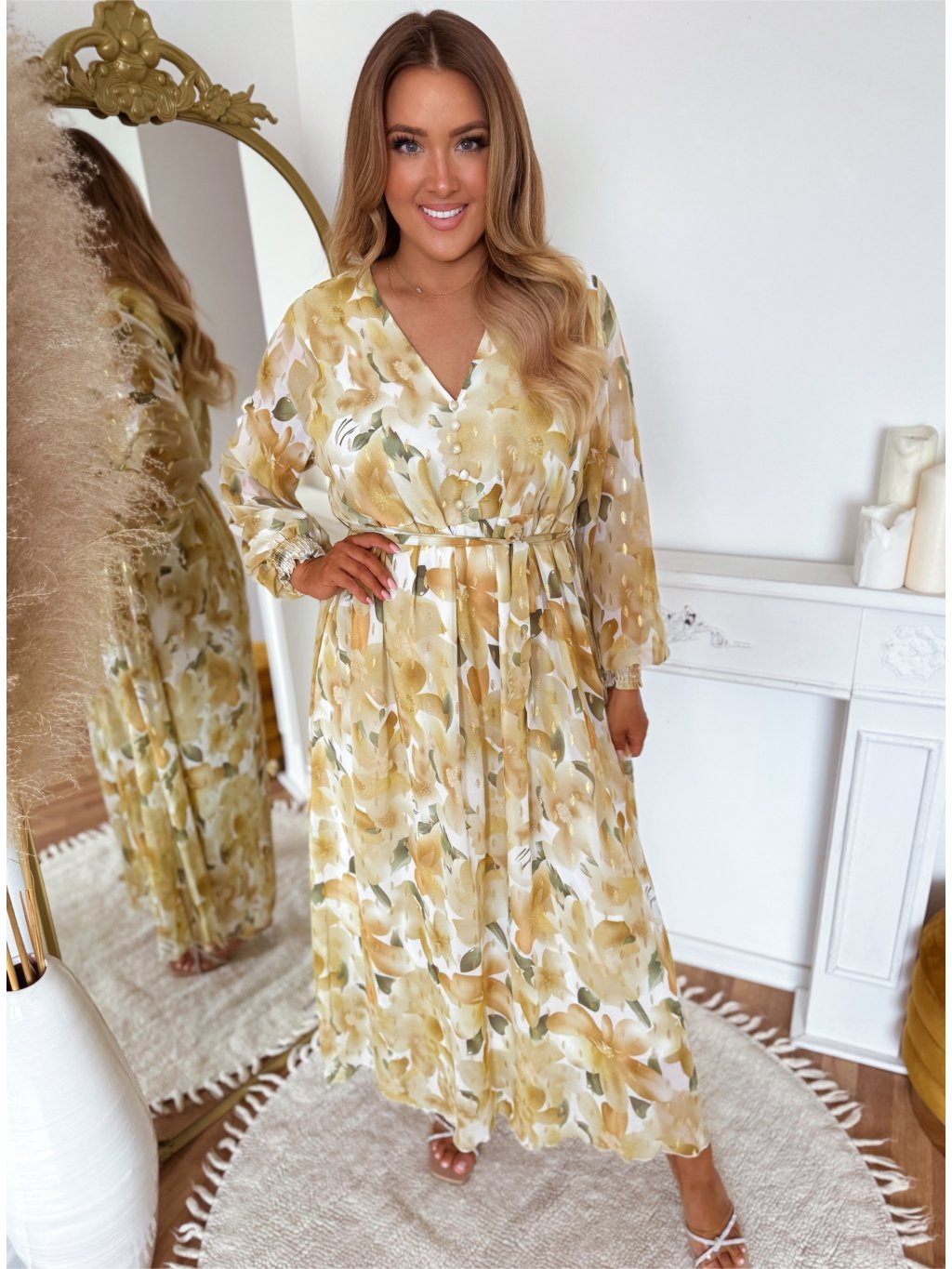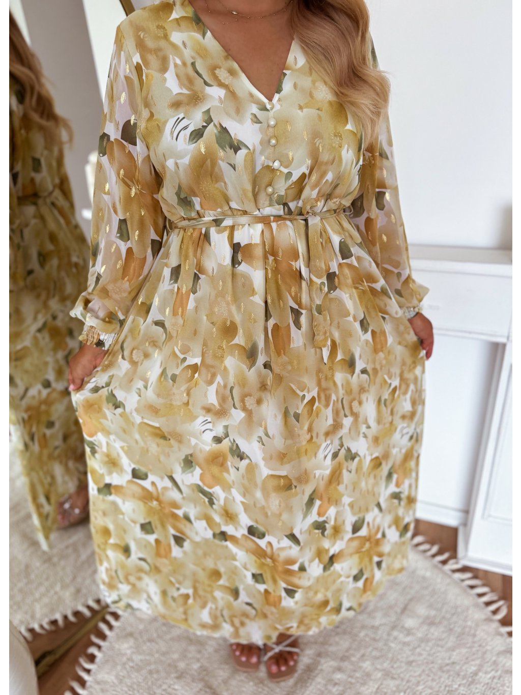 Az ünnepélyes, virágos maxiruhának teljesen laza szabása van, és a derekánál övvel szűkíthető. A ruhán díszgombok vannak. A modell 168 cm magas és XL/XXL méretet visel.
