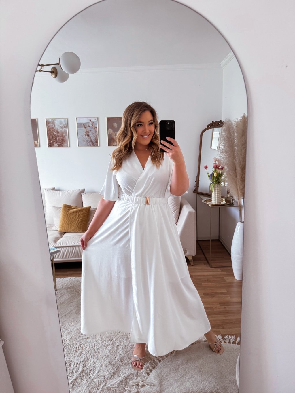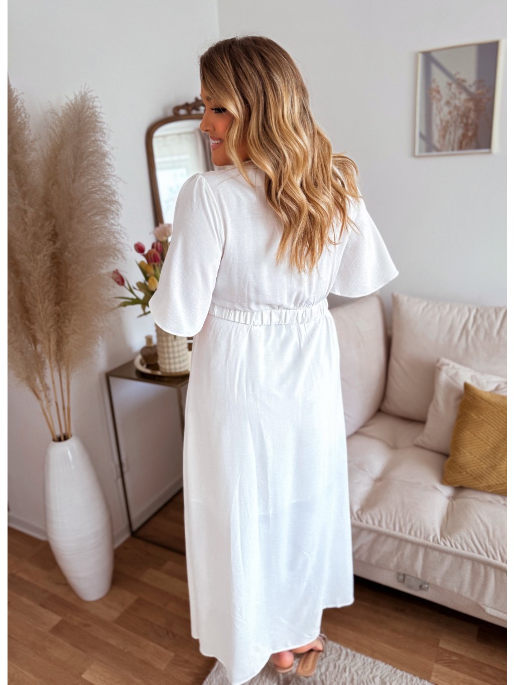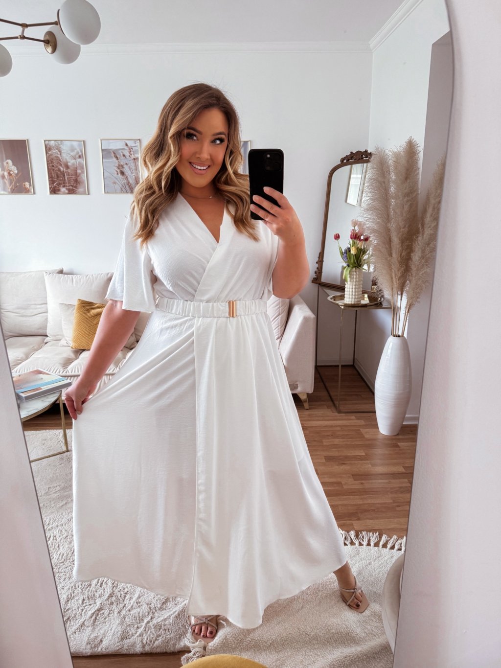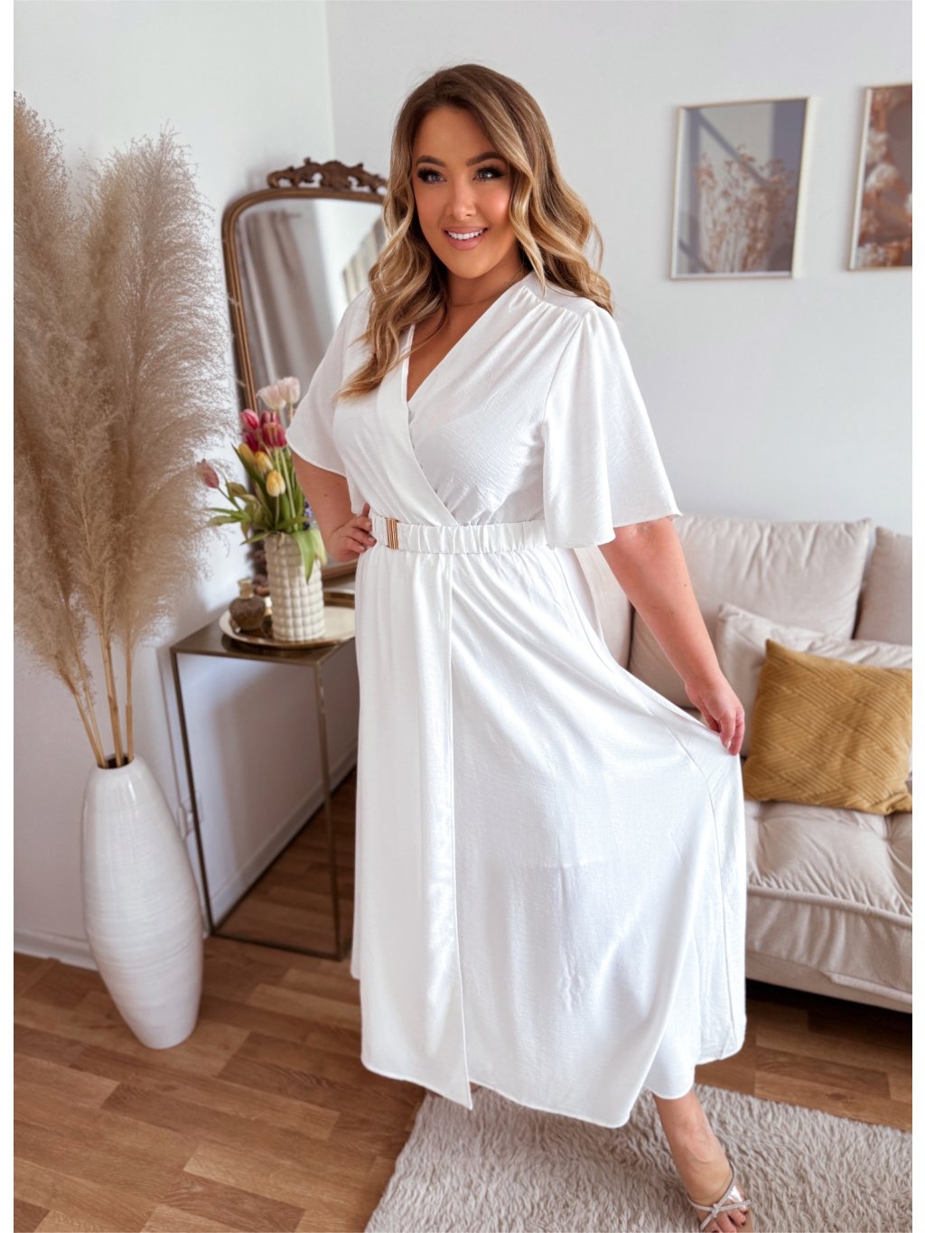 Hosszú, elegáns, fehér, női ruha moletteknek, rövid ujjú és hasítékkal. A ruha derekán gumírozás és öv található. A model mér 168 cm, és XL-es méretet visel.