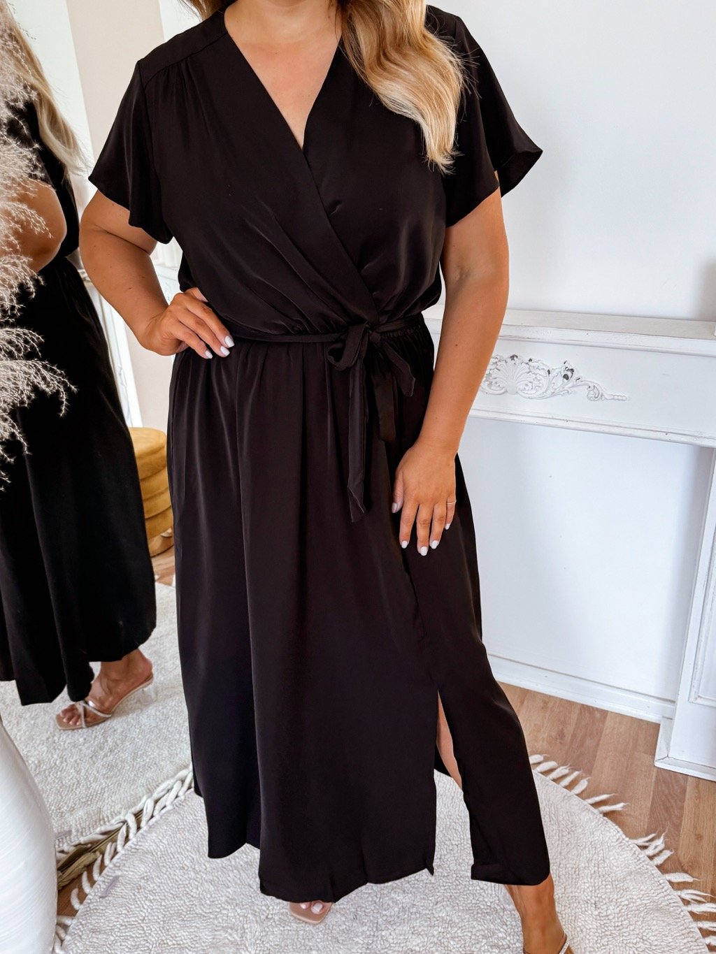 Hosszú fekete női ruha moletteknek, rövid ujjú és hasítékkal. A ruha derekán gumírozás és öv található. A model mér 168 cm, és XL-es méretet visel.
