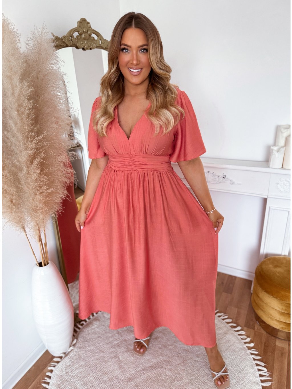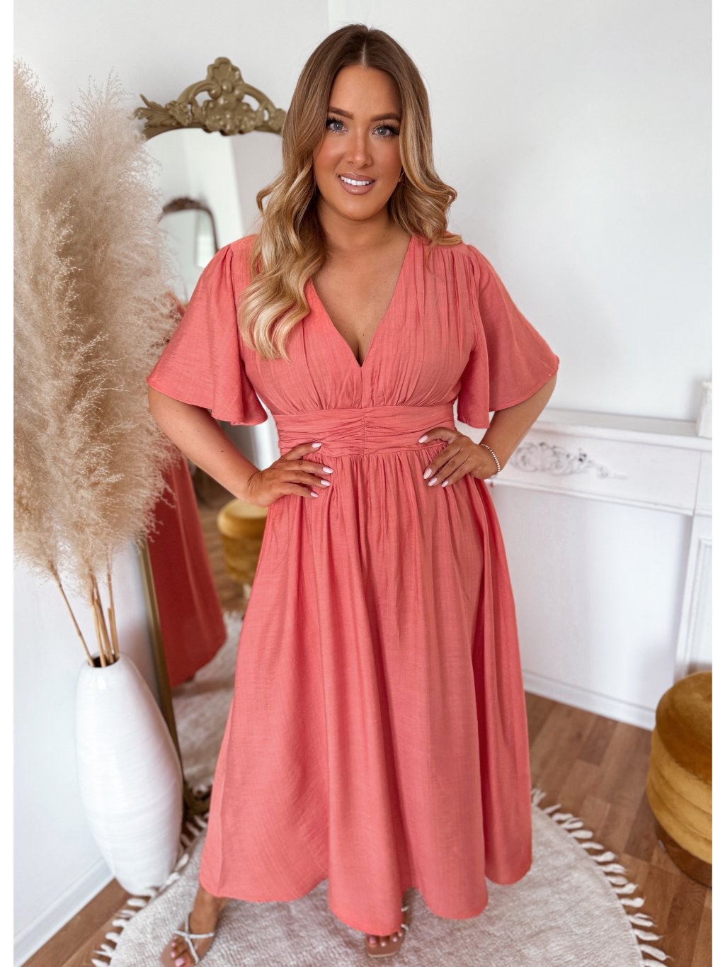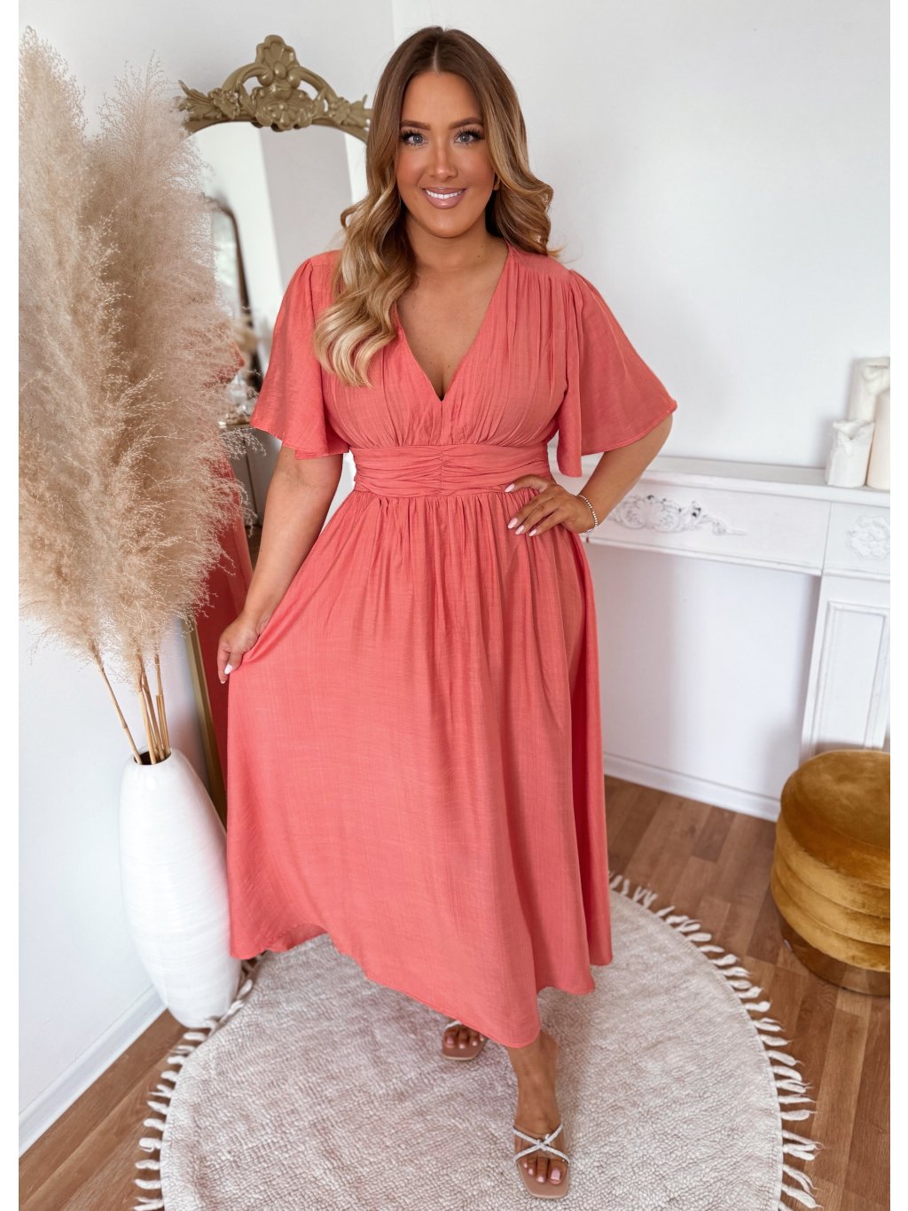 Hosszú plus size ruha rövid ujjal, a ruha derekán gumírozott, a ruha szoknyája teljesen bő szabású. A model mér 168 cm, és XL-es méretet visel.
