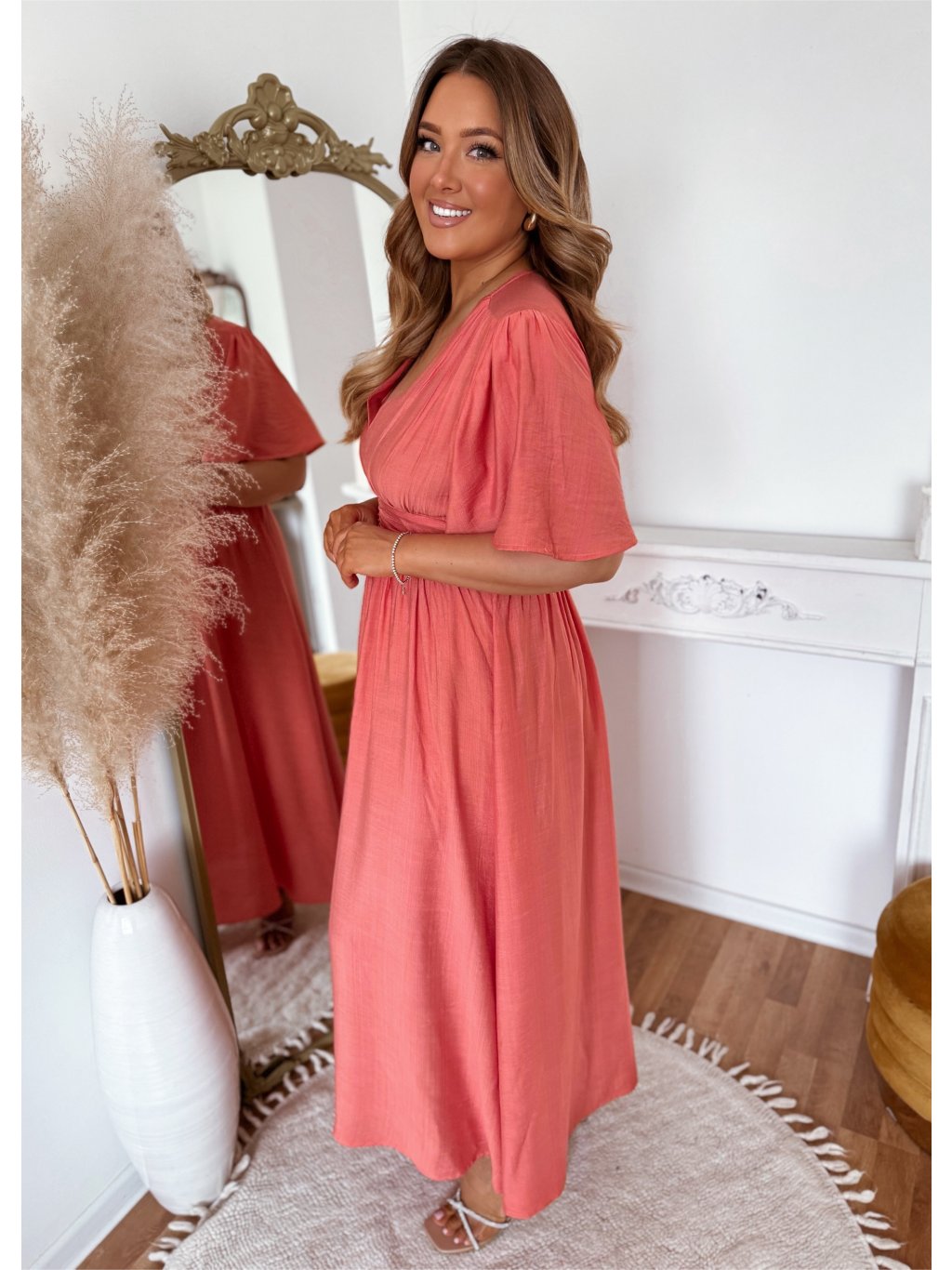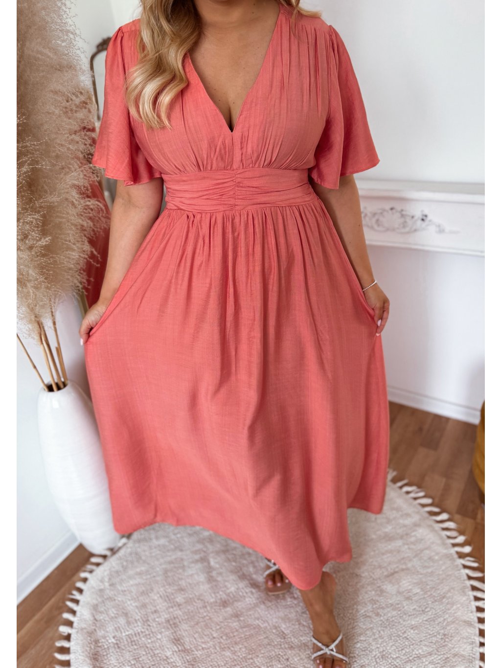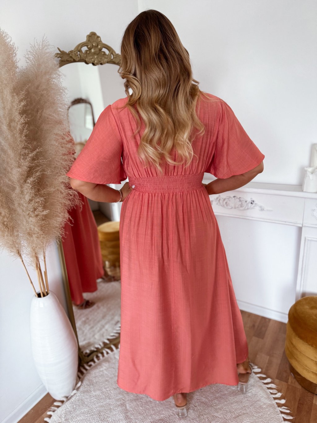 Hosszú plus size ruha rövid ujjal, a ruha derekán gumírozott, a ruha szoknyája teljesen bő szabású. A model mér 168 cm, és XL-es méretet visel.