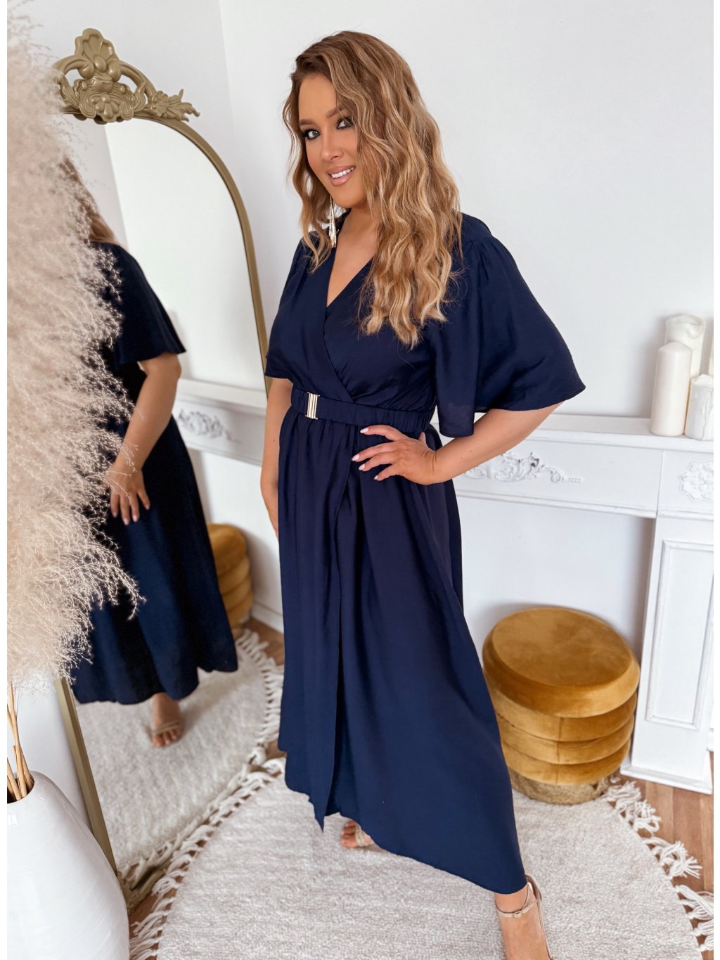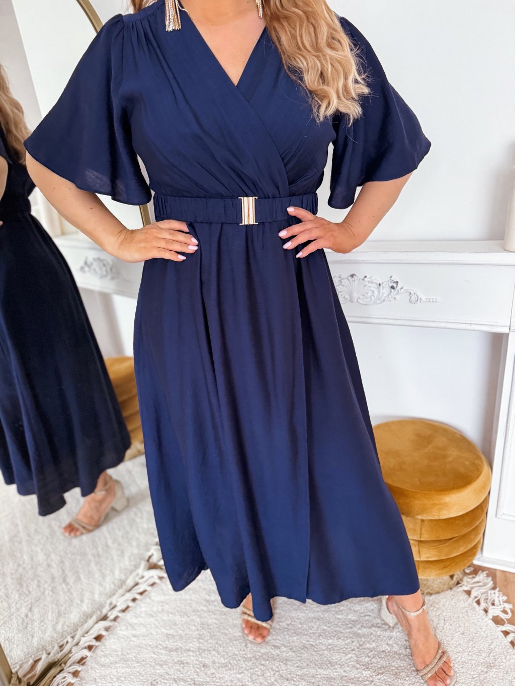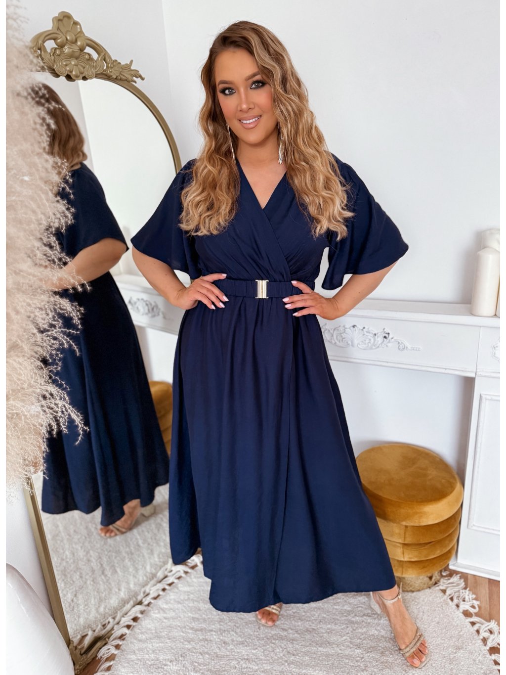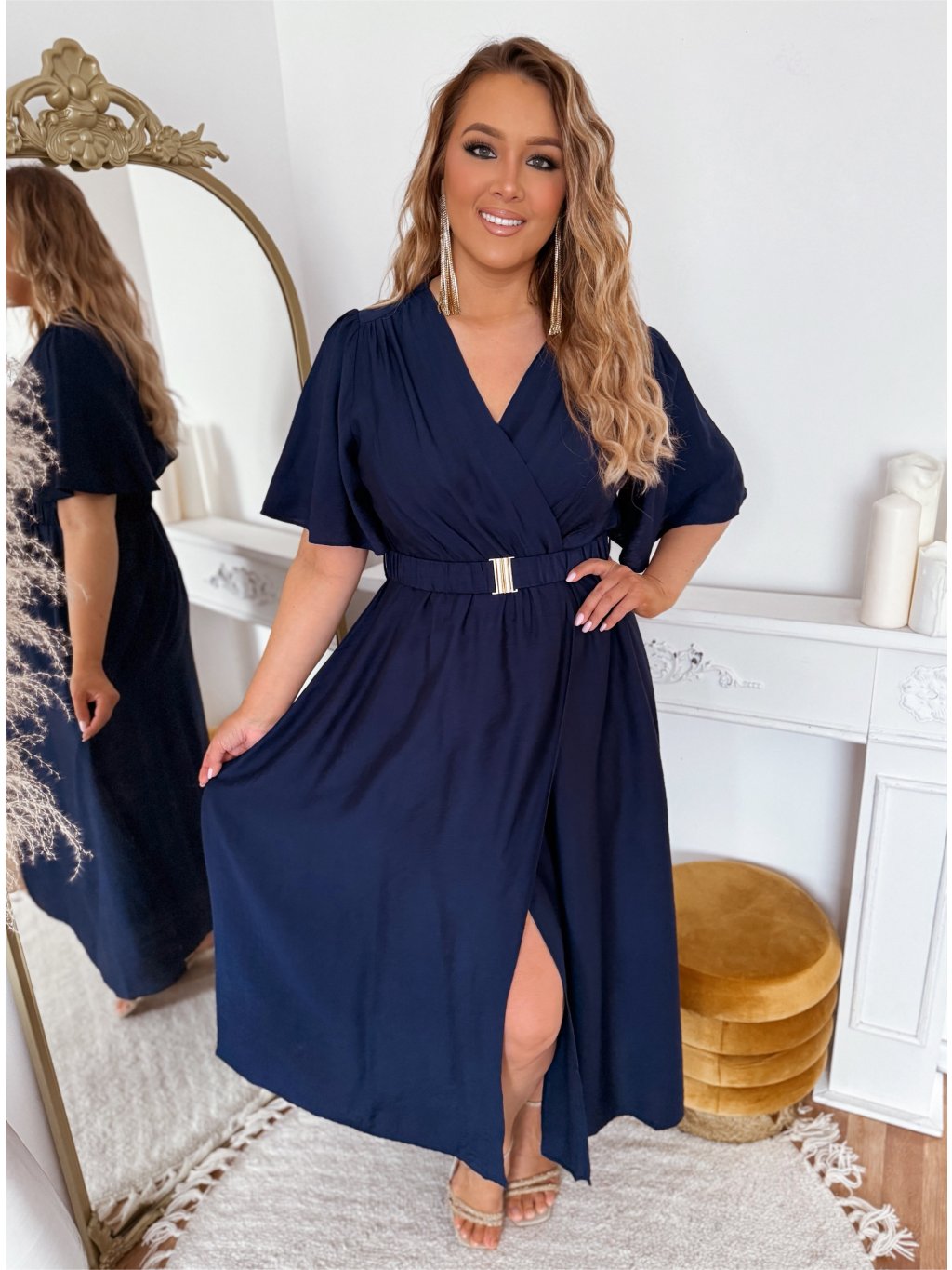 Hosszú, elegáns, sötétkék, női ruha molett hölgyeknek, rövid ujjú és slicceléssel. A ruha derekán gumírozás és öv található. A model mér 168 cm, és XL-es méretet visel.