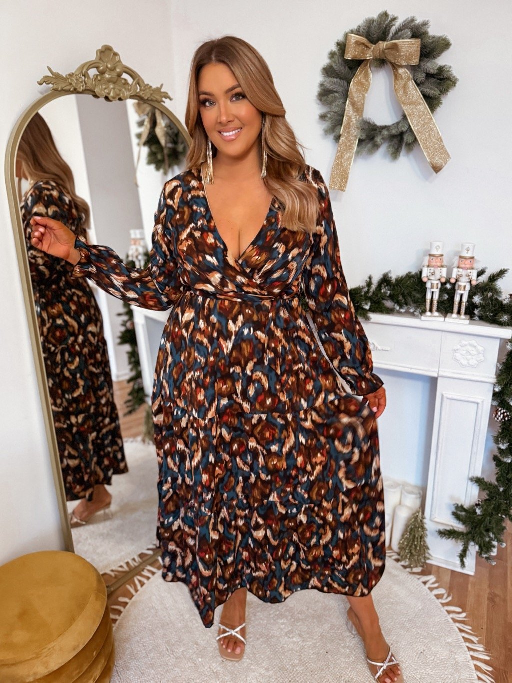 Elegáns, hosszú ujjú, V-nyakú, színes ruha. A mell alatt elasztikus gumipánt található. A modell 168 cm magas és L/XL méretet visel.