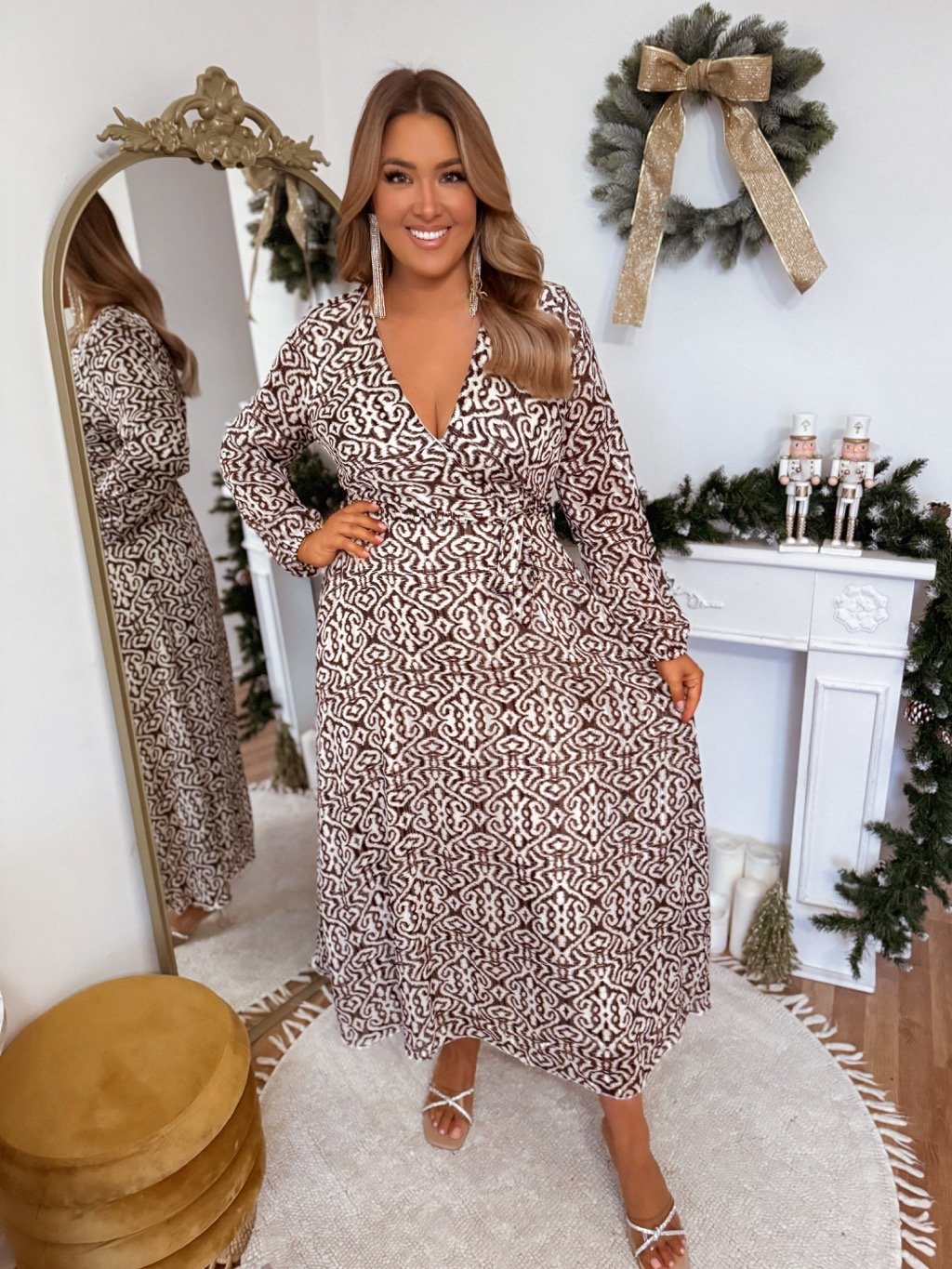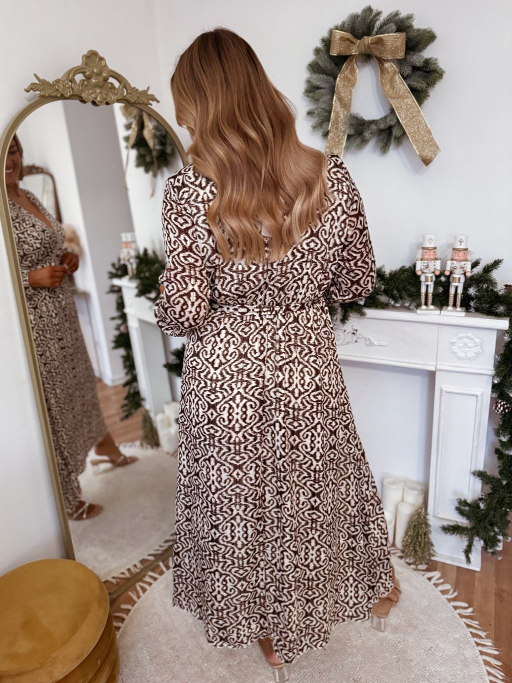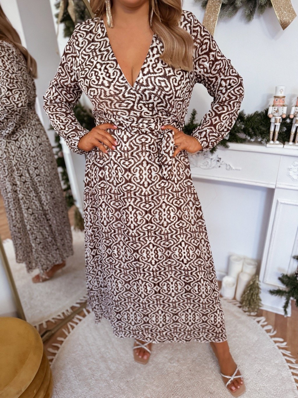 Elegáns mintás, hosszú ujjú, V-nyakú ruha. A mell alatt elasztikus gumipánt található. A modell 168 cm magas és L/XL méretet visel.