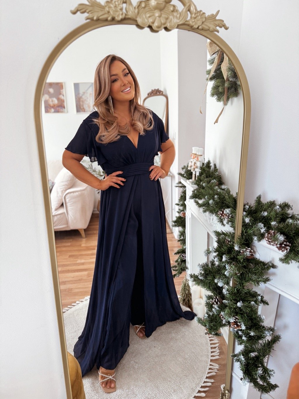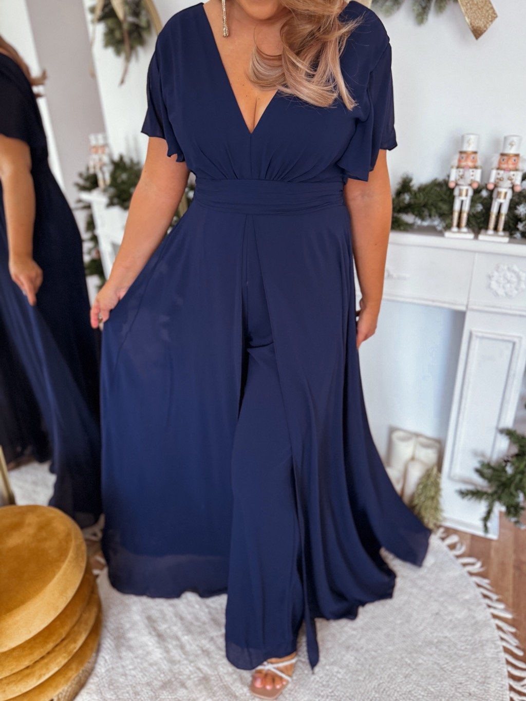 Ez az elegáns overál hátul cipzárral és derékban gumival rendelkezik. Hátulról úgy néz ki, mint egy klasszikus ruha, a szoknya szépen lengve járás közben. A modell 168 cm magas és XL (42) méretet visel.