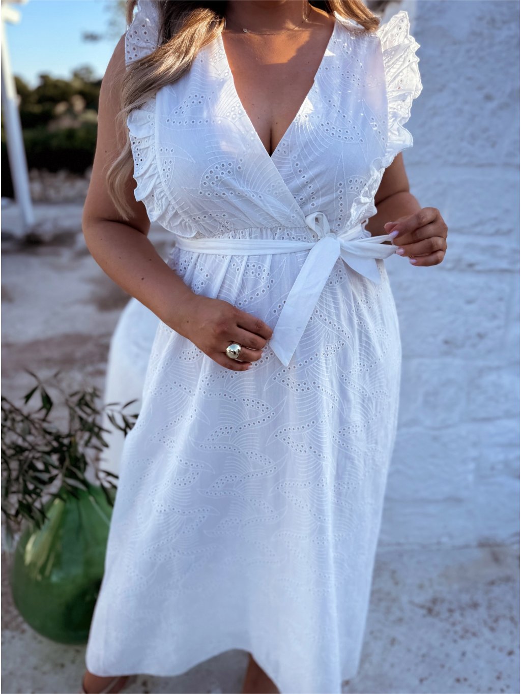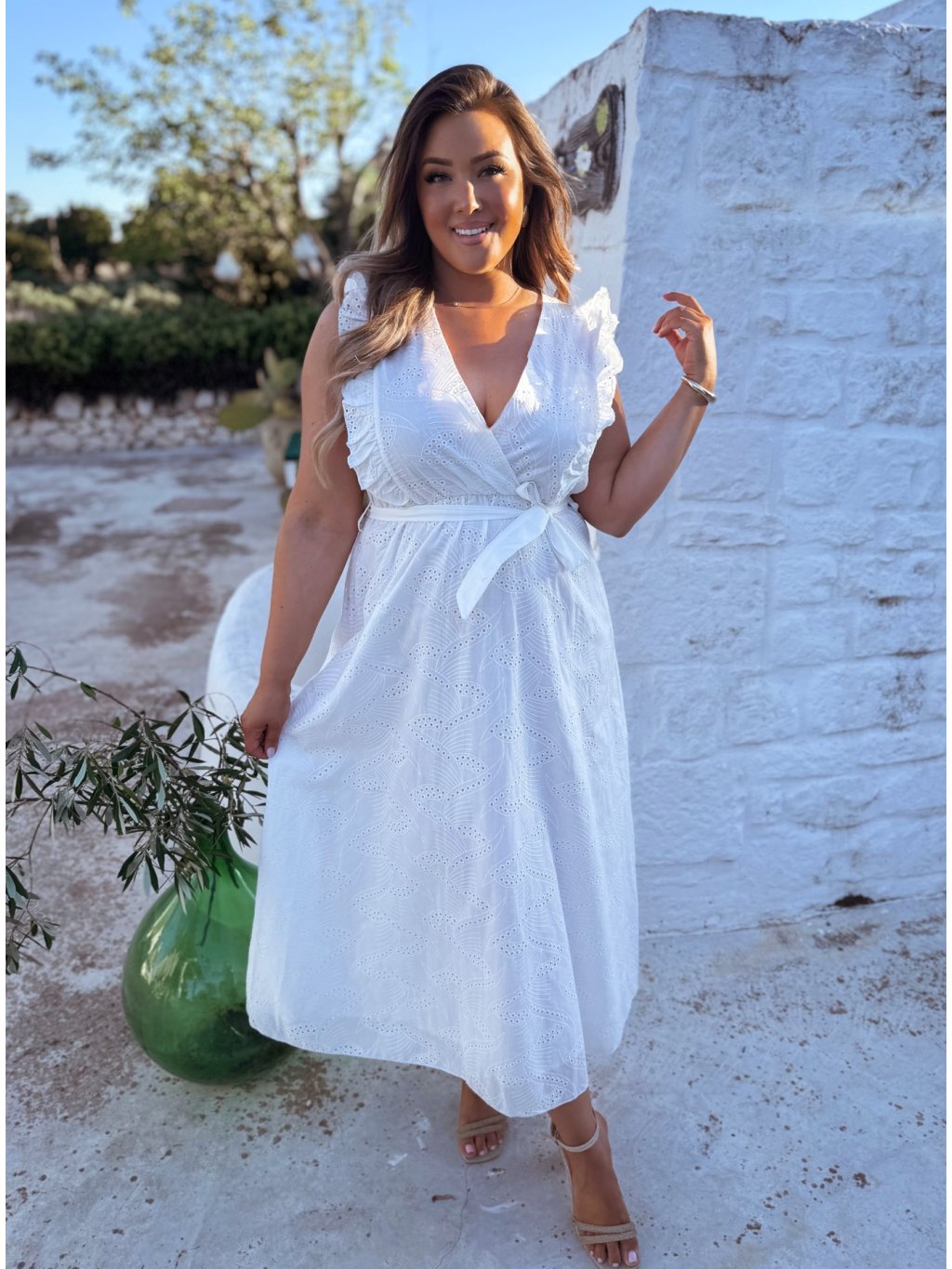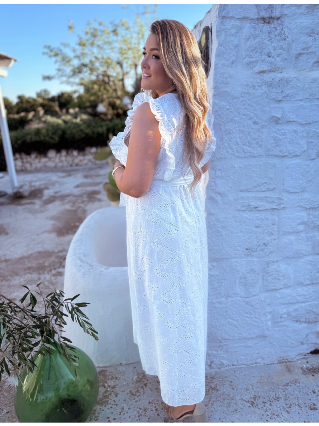 Hosszú, fehér, pamut női ruha madeira csipkével, V-kivágással és rövid fodros ujjakkal. A ruha derekán gumírozás és öv található. A modell 168 cm magas és XL/XXL méretet visel.