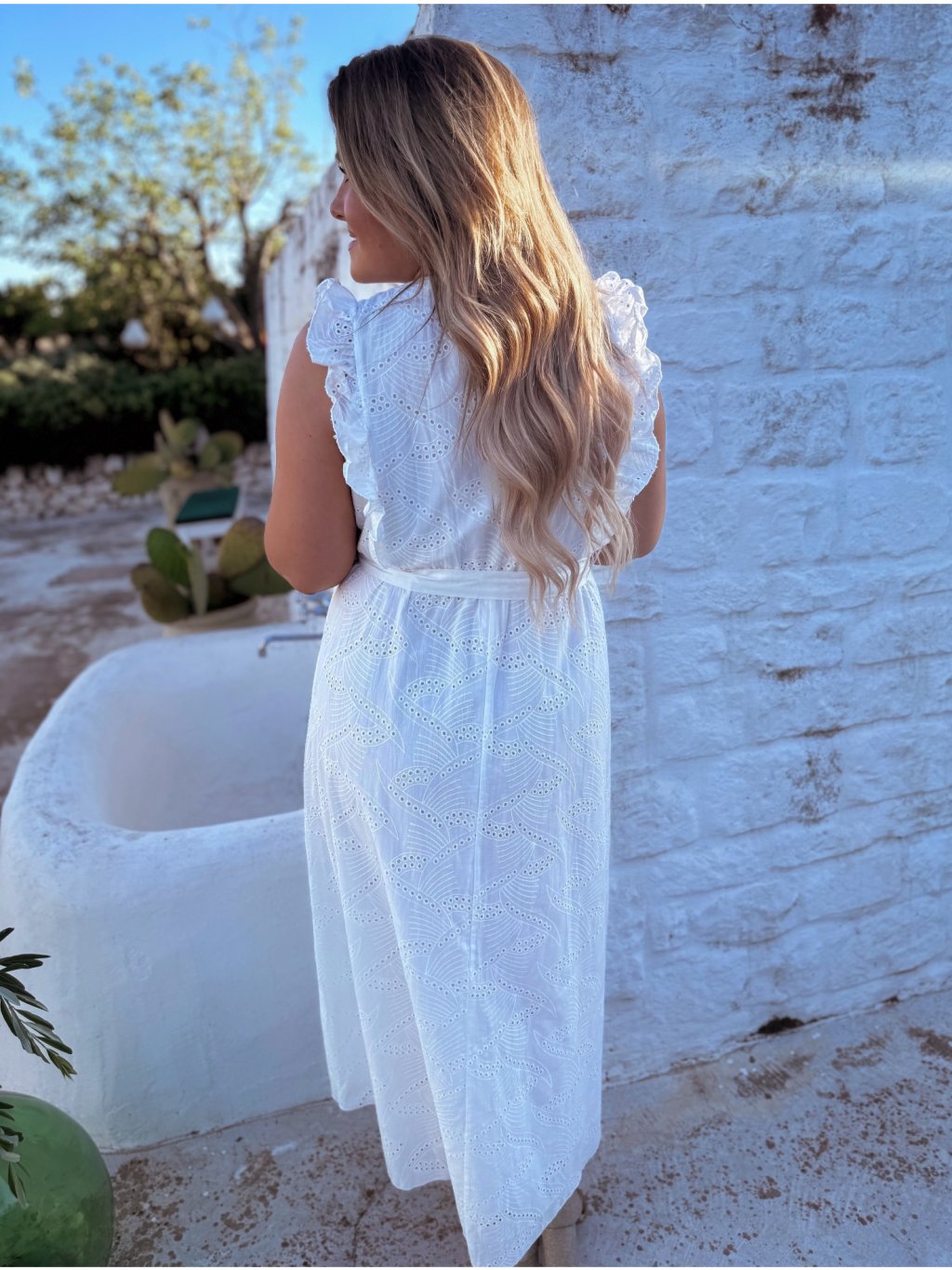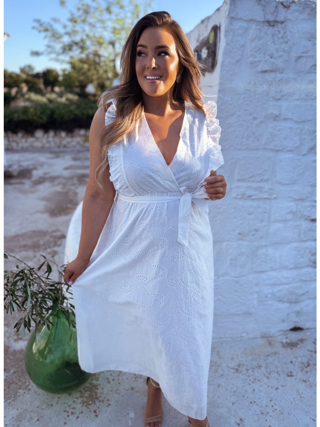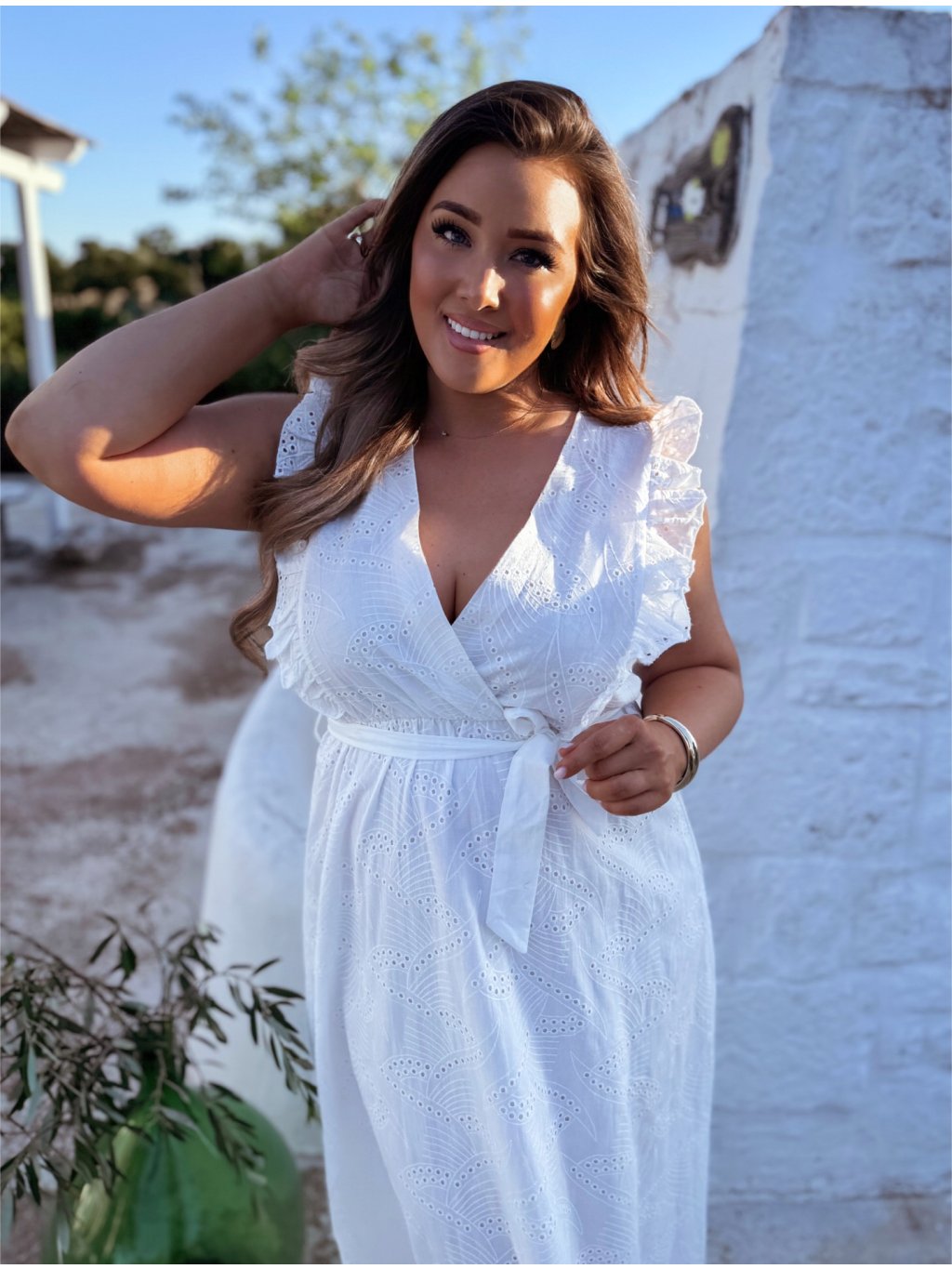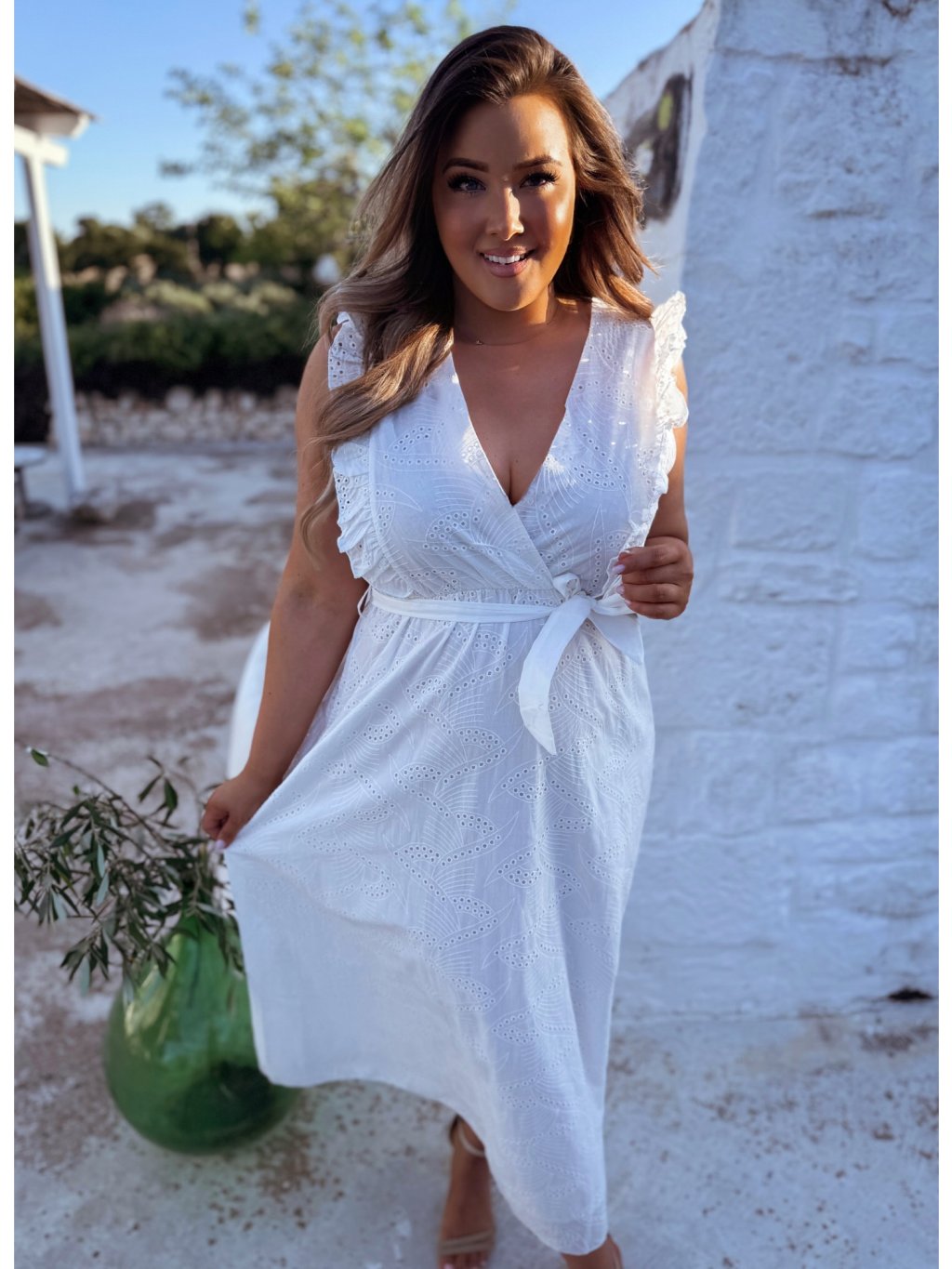 Hosszú, fehér, pamut női ruha madeira csipkével, V-kivágással és rövid fodros ujjakkal. A ruha derekán gumírozás és öv található. A modell 168 cm magas és XL/XXL méretet visel.
