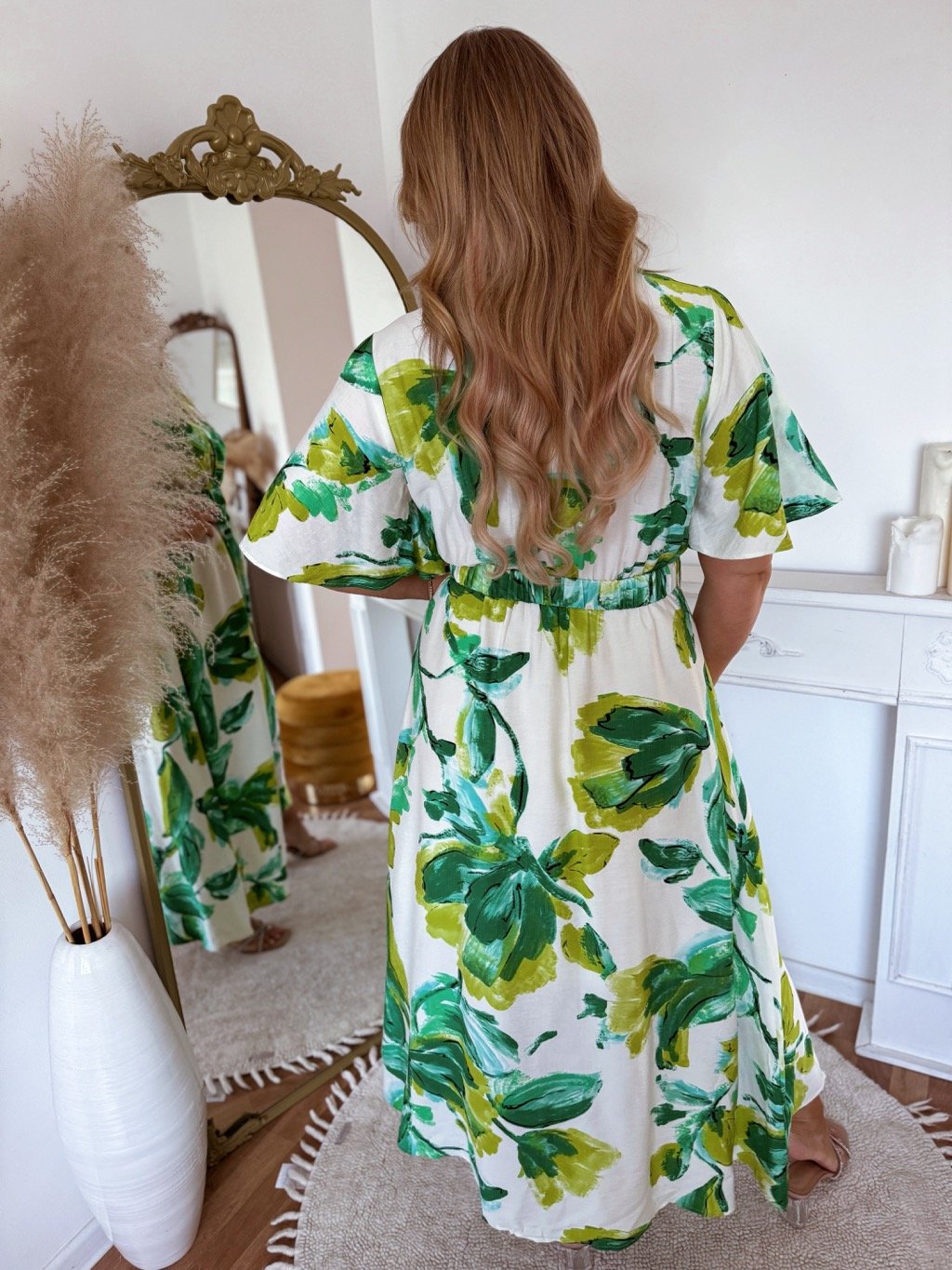 Hosszú fehér ruha zöld virágokkal