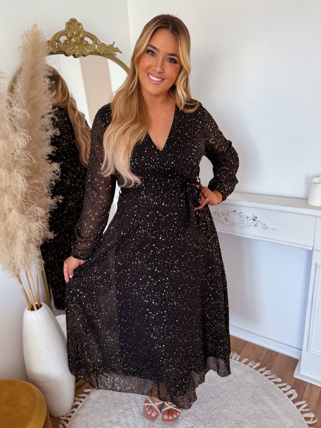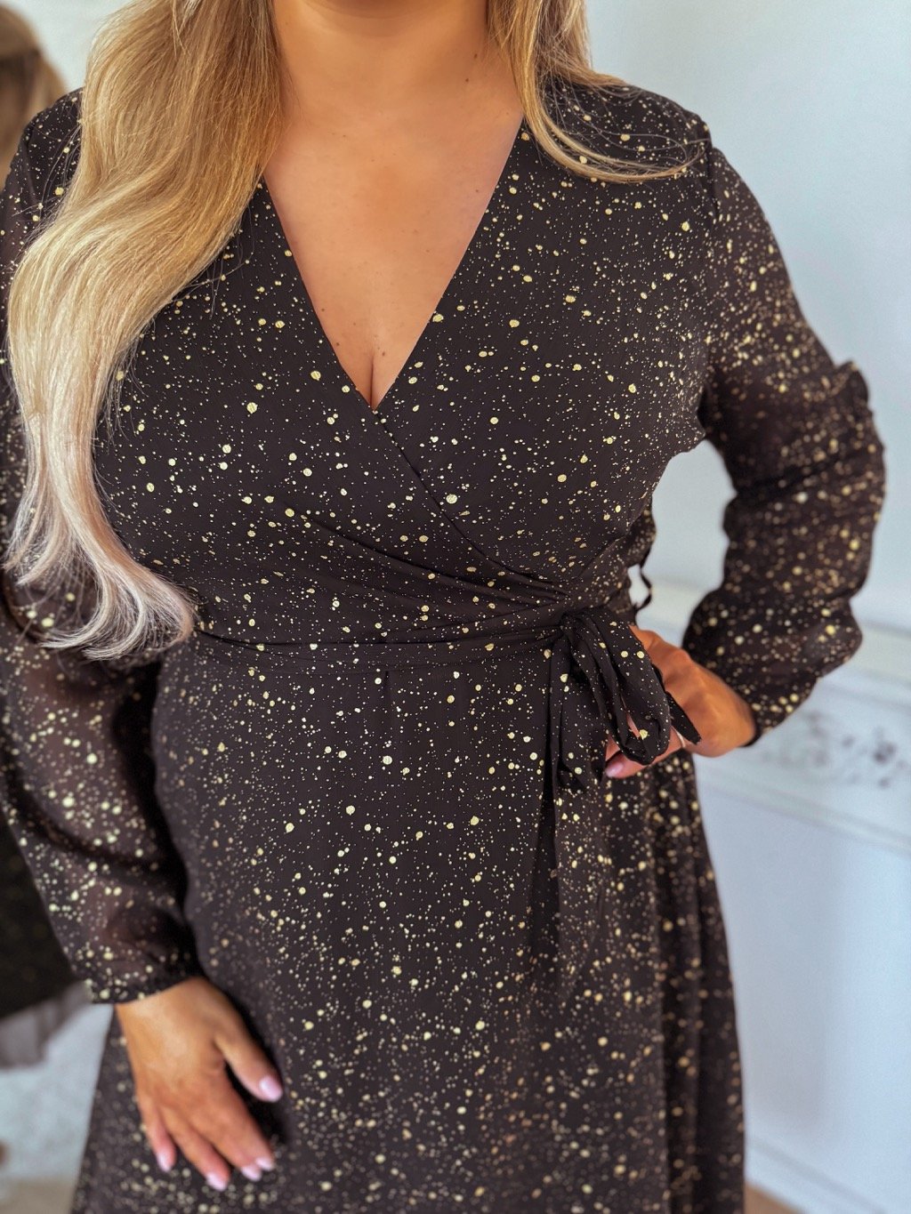Hosszú, elegáns női ruha arany mintával az anyagon. A derékrésznél gumírozott. A deréktól lefelé a ruha bő. A modell 168 cm magas és XL/XXL méretet visel.