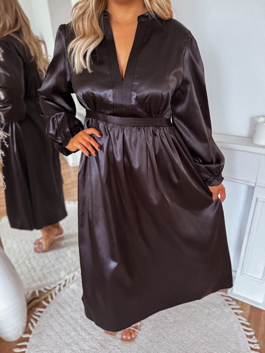 Az elegáns, fényes fekete, hosszú ujjú ruha elasztikus derékpánttal és bő szoknyával rendelkezik. A model mér 168 cm, és XL-es méretet visel.