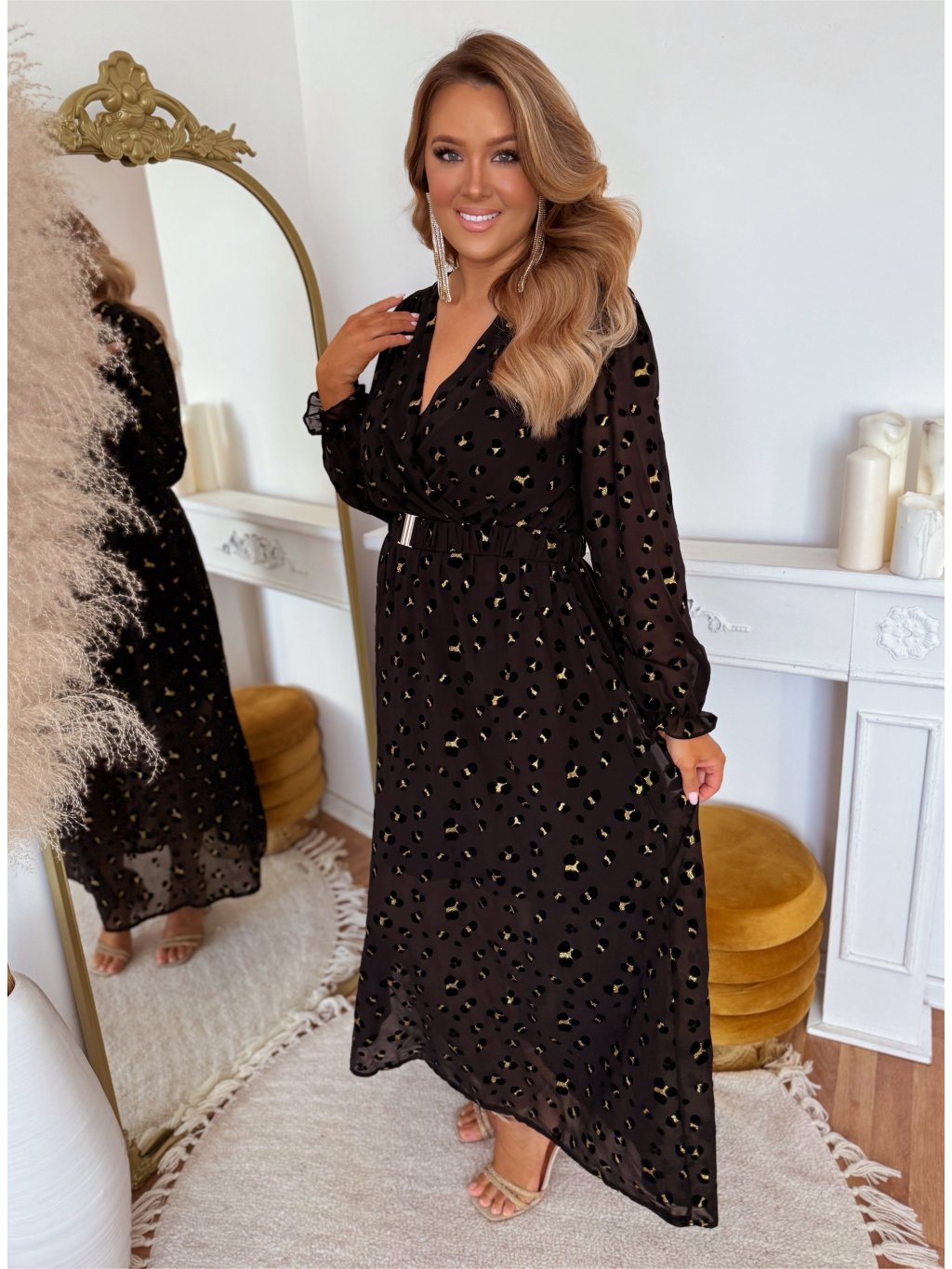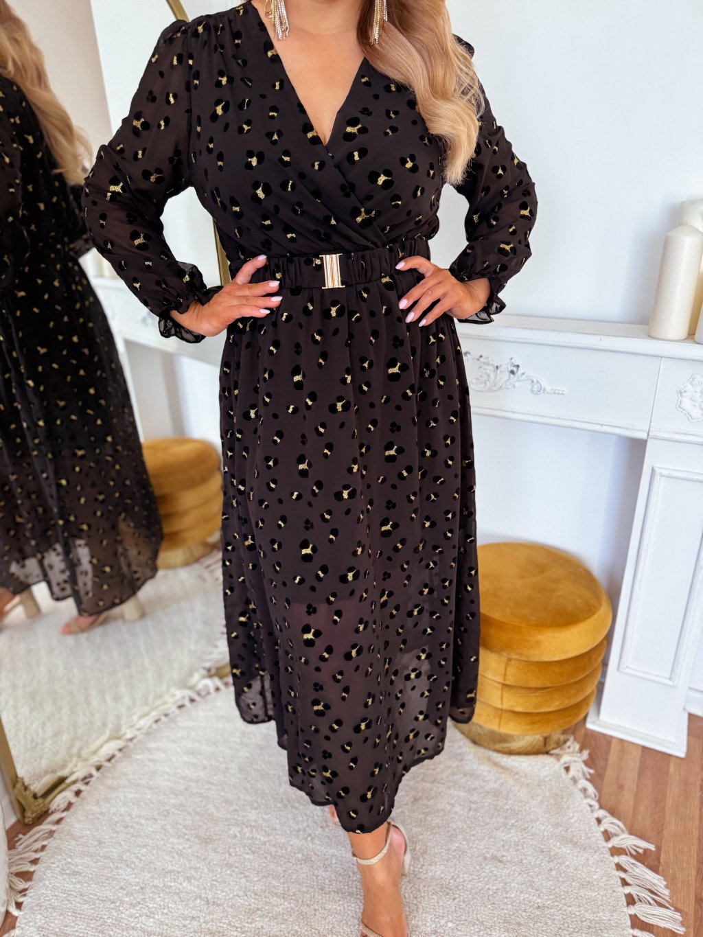 Hosszú fekete női ruha moletteknek, hosszú ujjú. A ruha derekán gumírozás és öv található. A model mér 168 cm, és XL-es méretet visel.