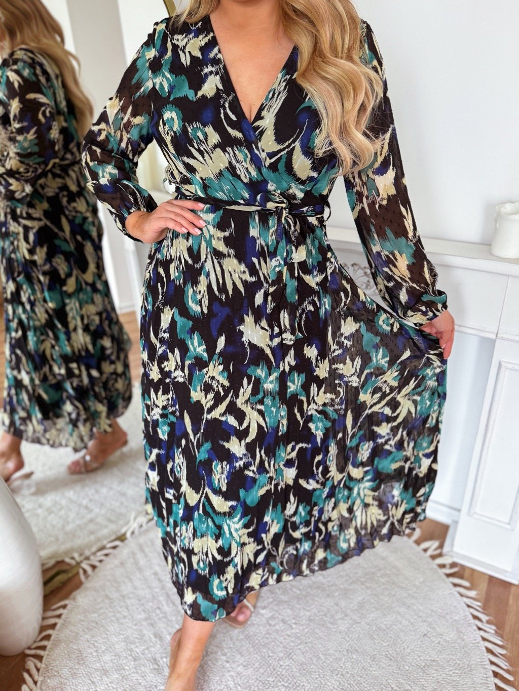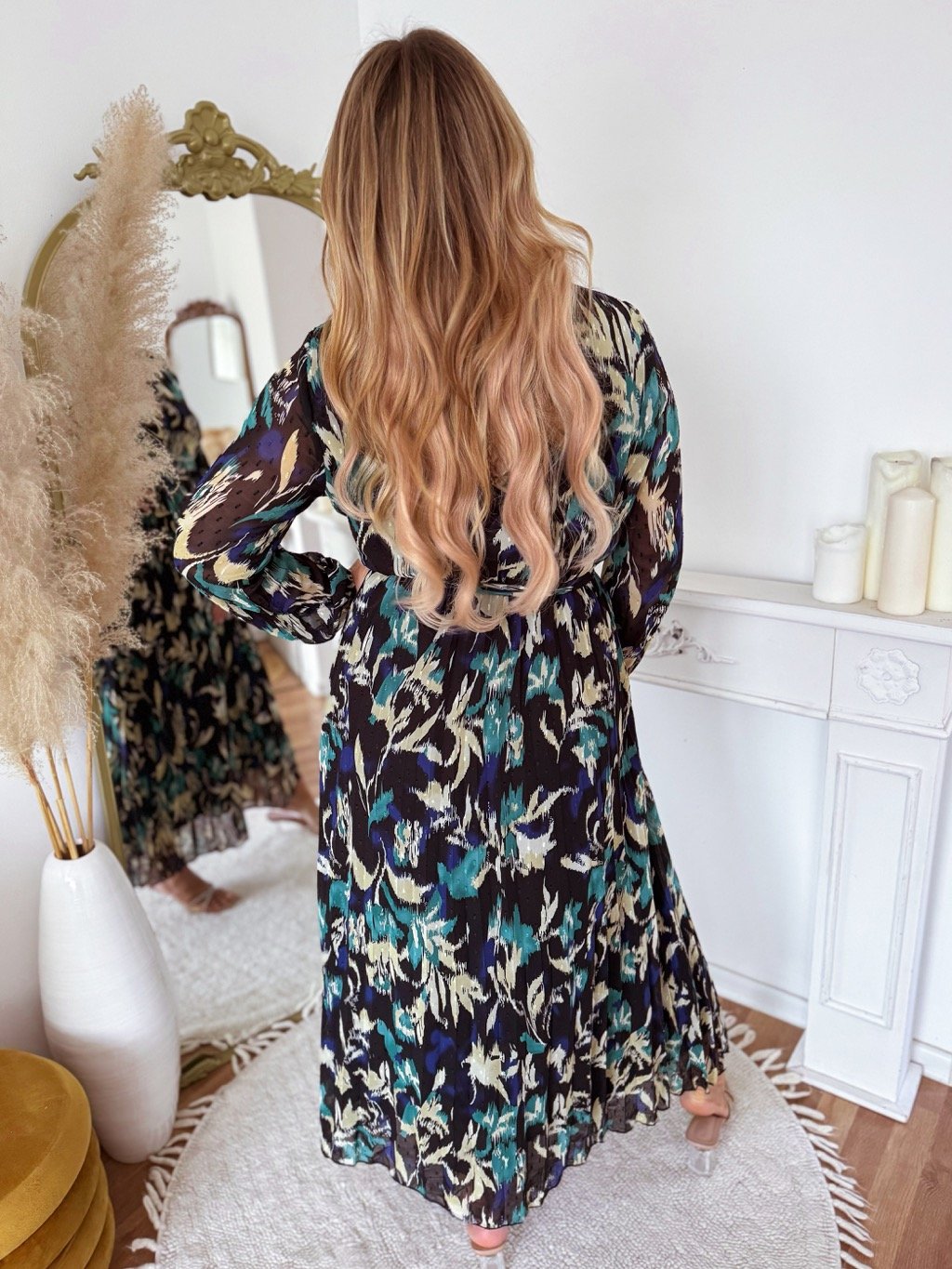 Elegáns, hosszú ujjú, öves, átlátszó ujjú ruha, a derékrészen bevarrt gumival, teljesen bő szoknyával. A modell 168 cm magas és L/XL méretet visel.