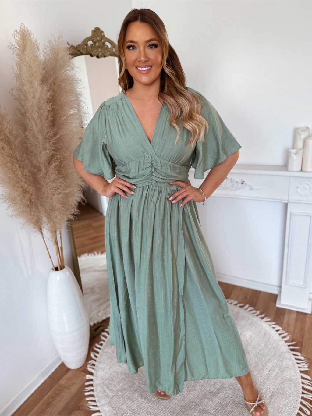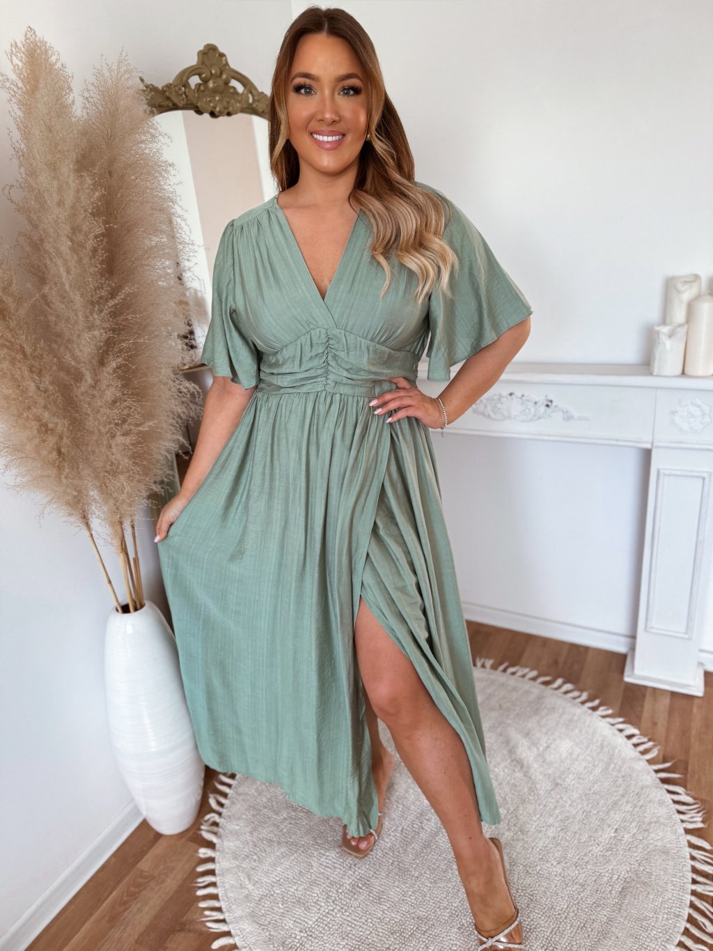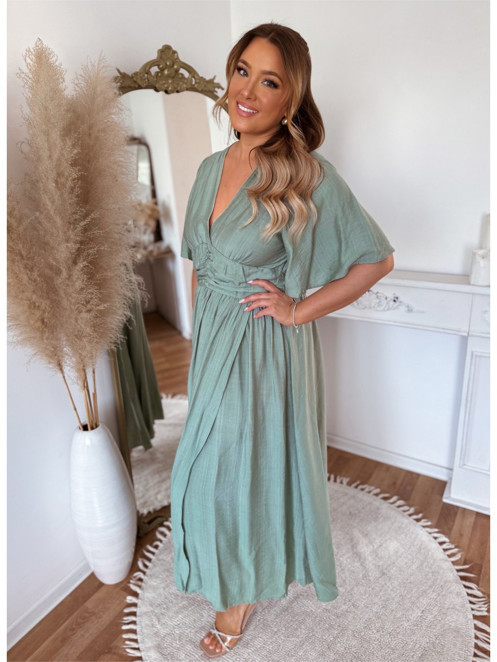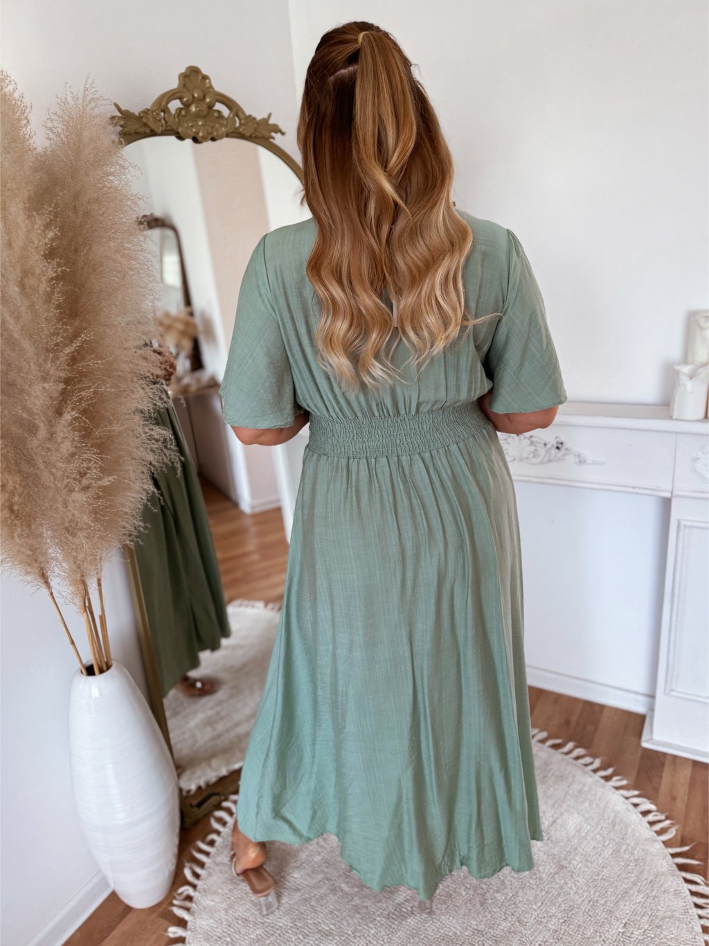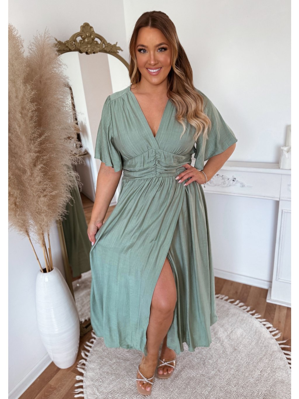 Hosszú, elegáns, halványzöld, rövid ujjú és hasítékkal ellátott női ruha molett hölgyeknek. A ruha derekán gumírozás található. A model mér 168 cm, és XL-es méretet visel.