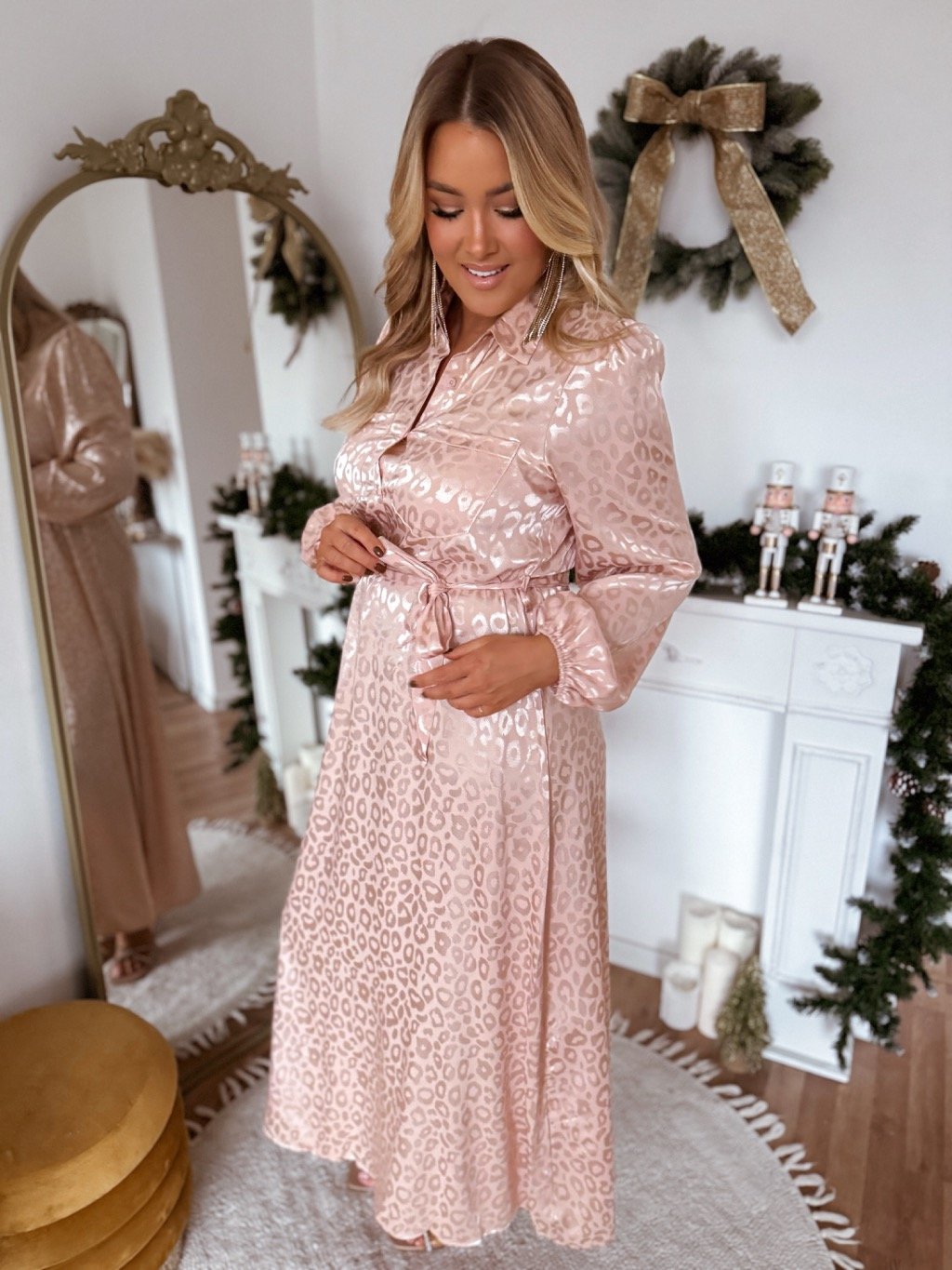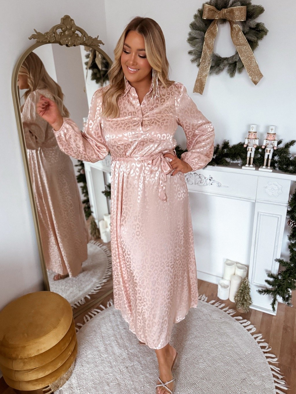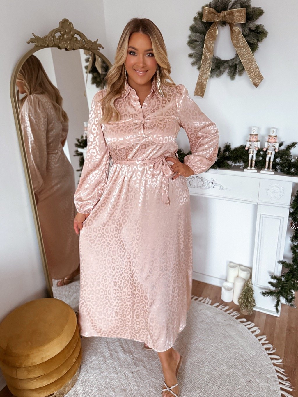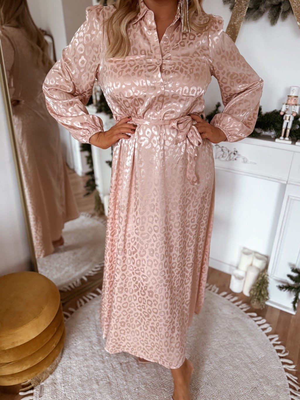 Hosszú, gombos, szatén női ruha a mellrészen. Ez a ruha övvel szűkíthető a deréknál, az anyag nem rugalmas. A modell 168 cm magas és L/XL méretet visel.