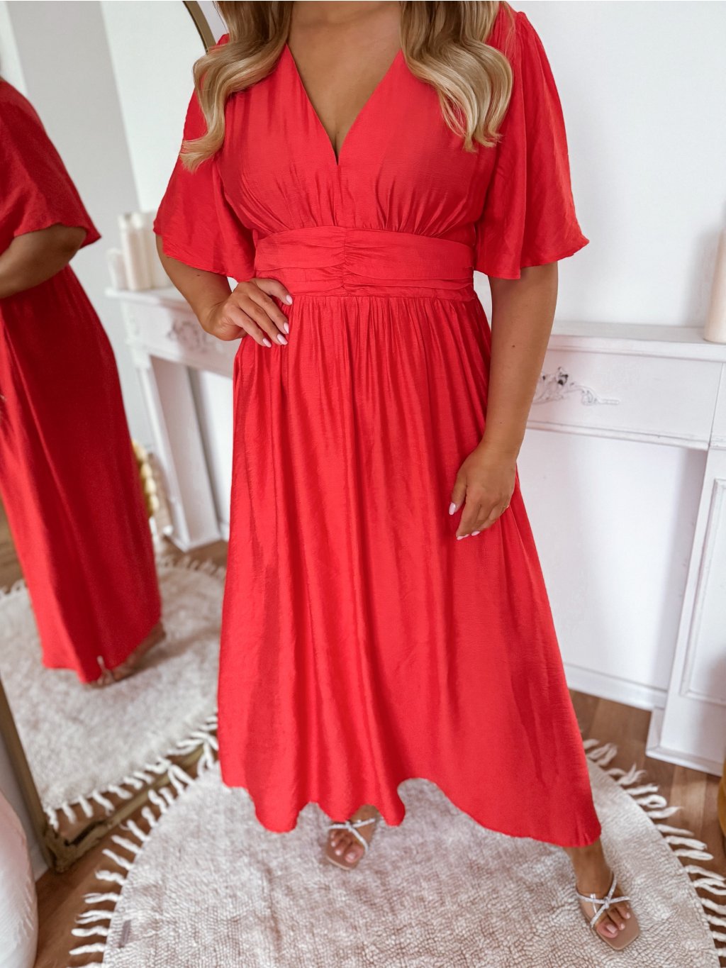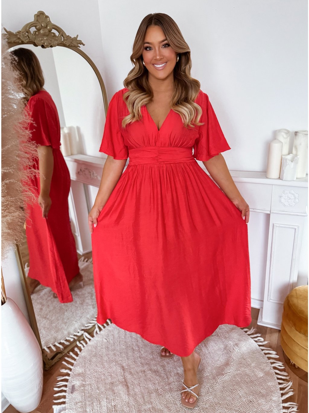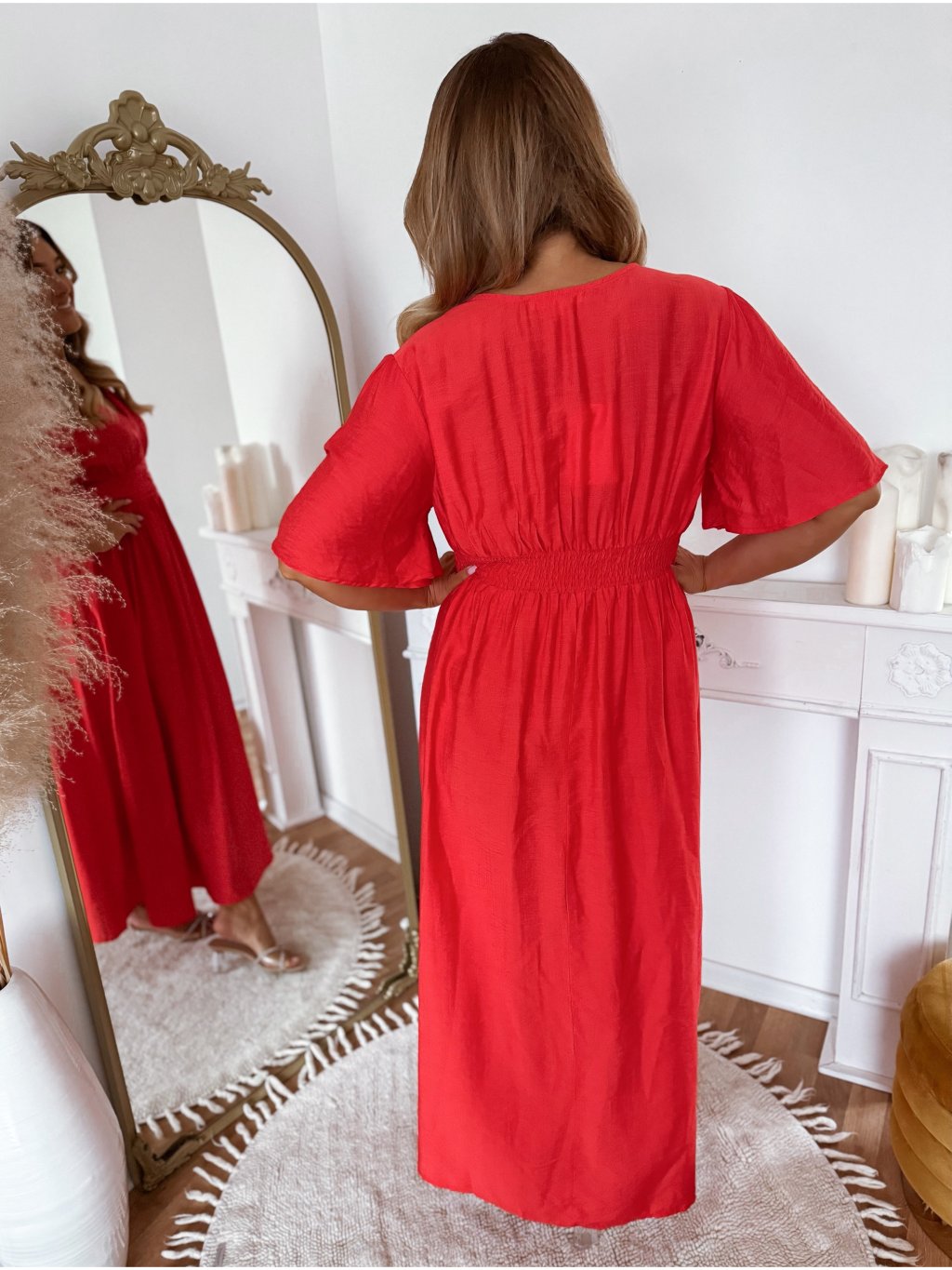 Hosszú plus size ruha rövid ujjal, a ruha derekán gumírozott, a ruha szoknyája teljesen bő szabású. A model mér 168 cm, és XL-es méretet visel.