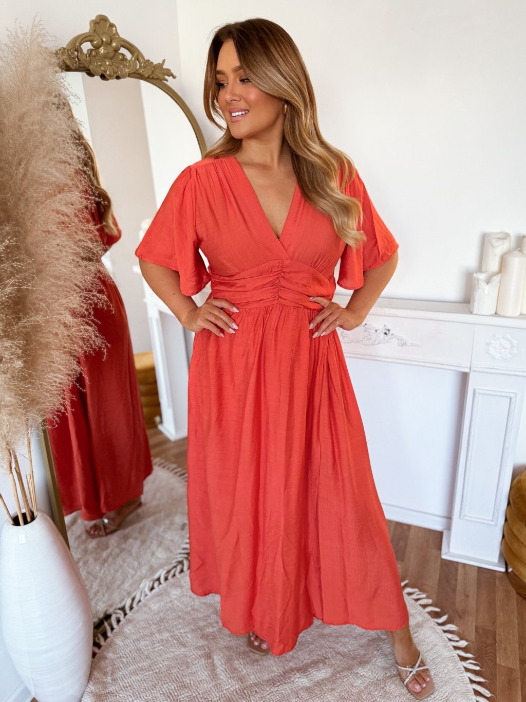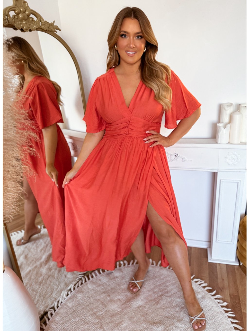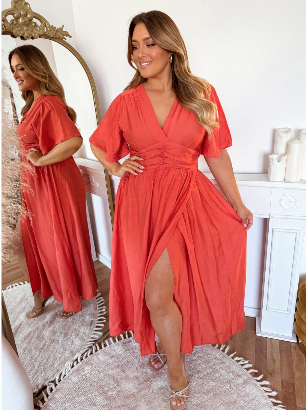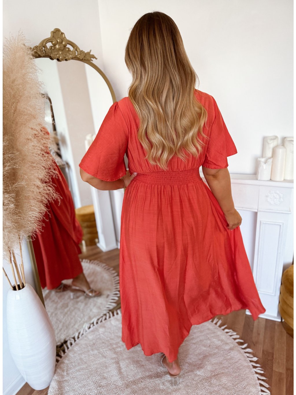 Hosszú, elegáns, korall színű női ruha moletteknek, rövid ujjú és hasítékkal. A ruha derekán gumírozás található. A ruha derekán gumírozás található. A model mér 168 cm, és XL-es méretet visel.