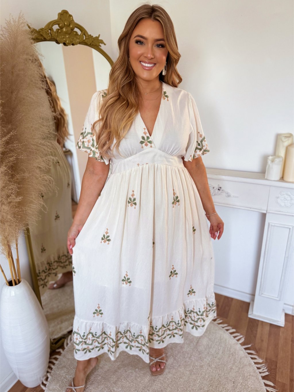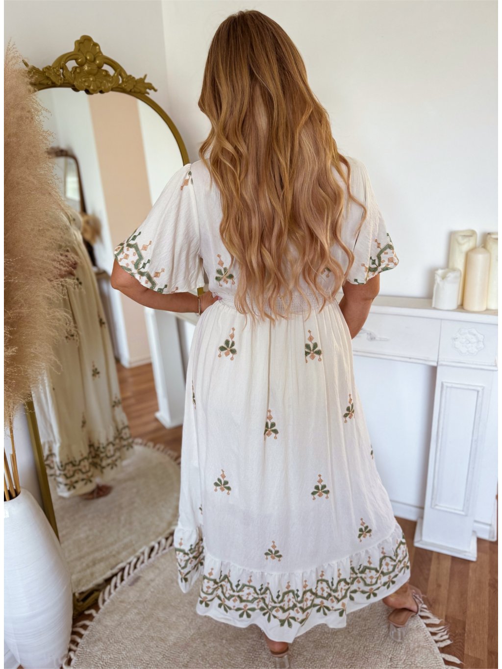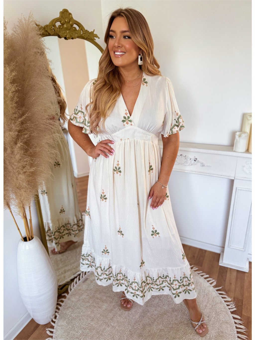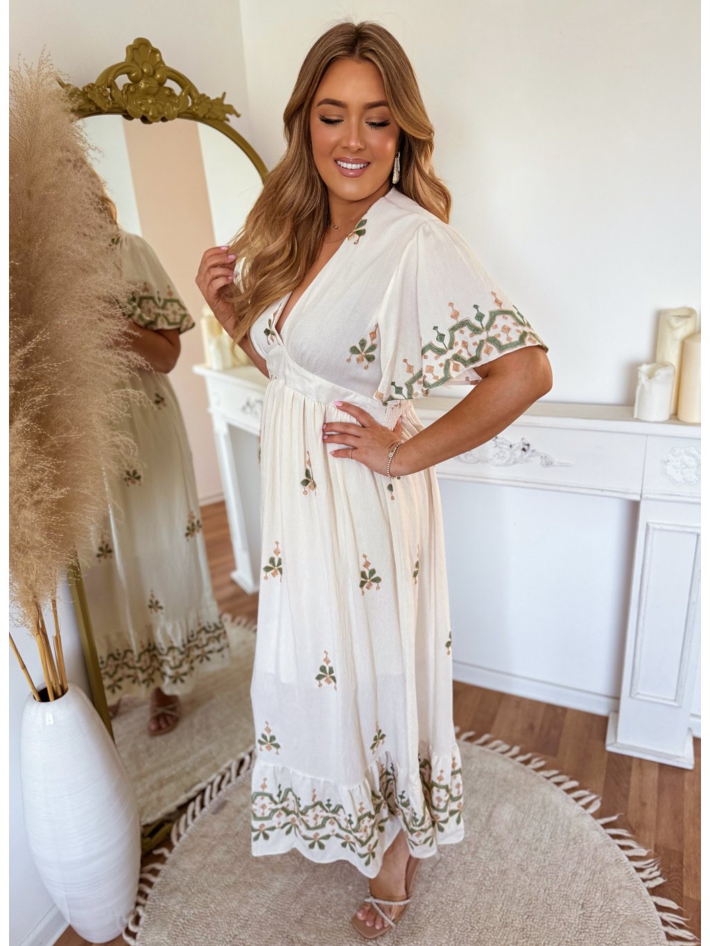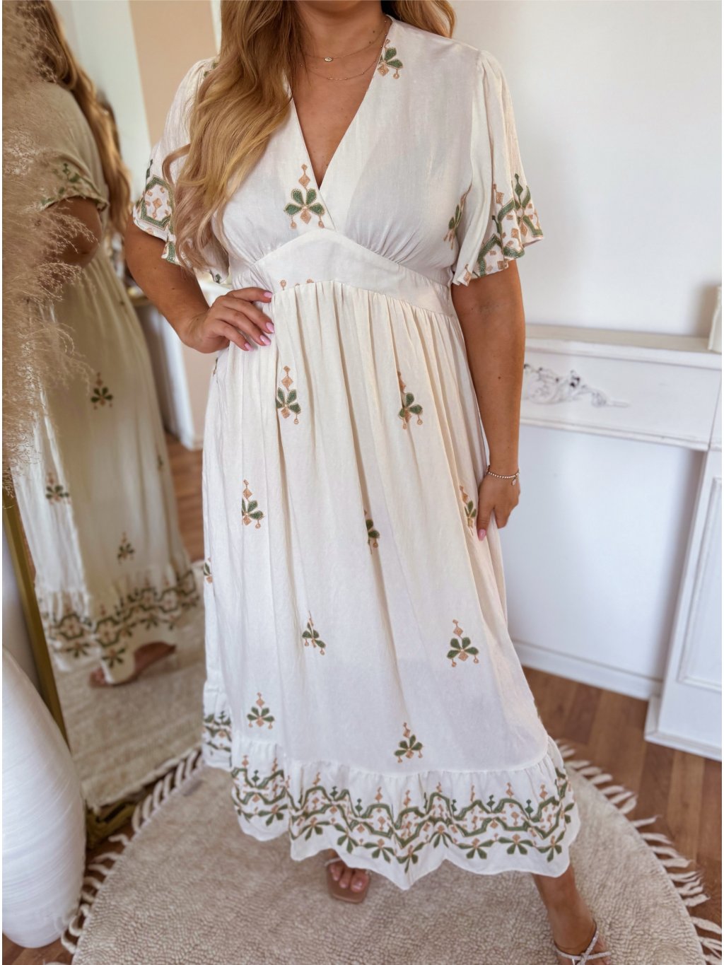 Hosszú, viszkóz, krémszínű ruha világoszöld hímzéssel. A ruhának lazább szabása van, és rugalmas gumiszalaggal a derékrészen, hátul. A ruha szoknyája teljesen bő. A model mér 168 cm, és XL-es méretet visel.