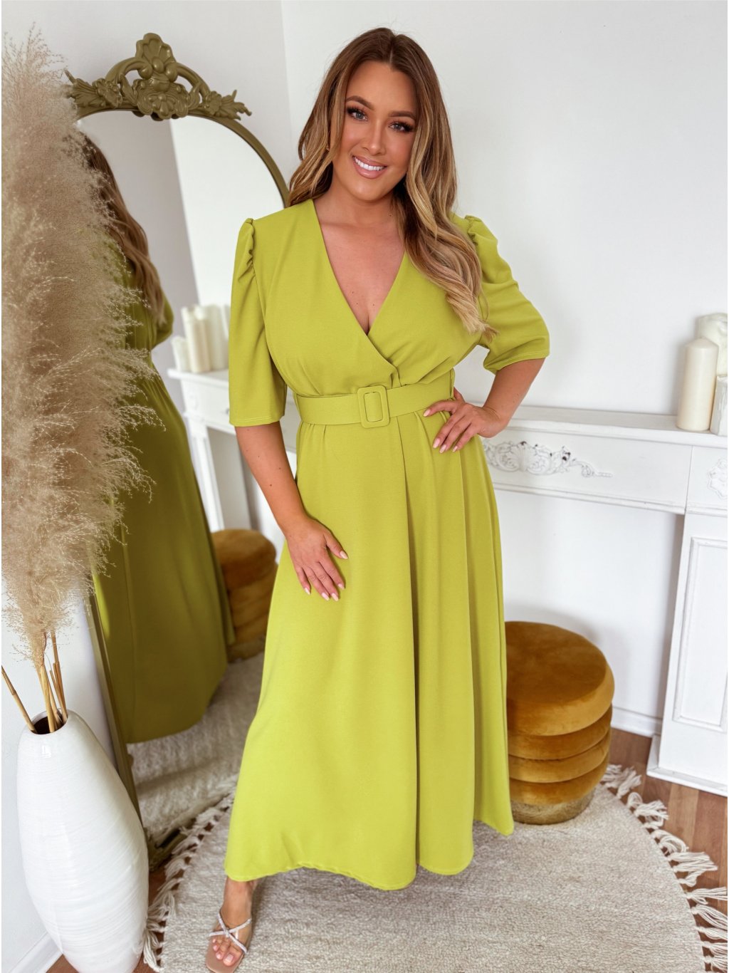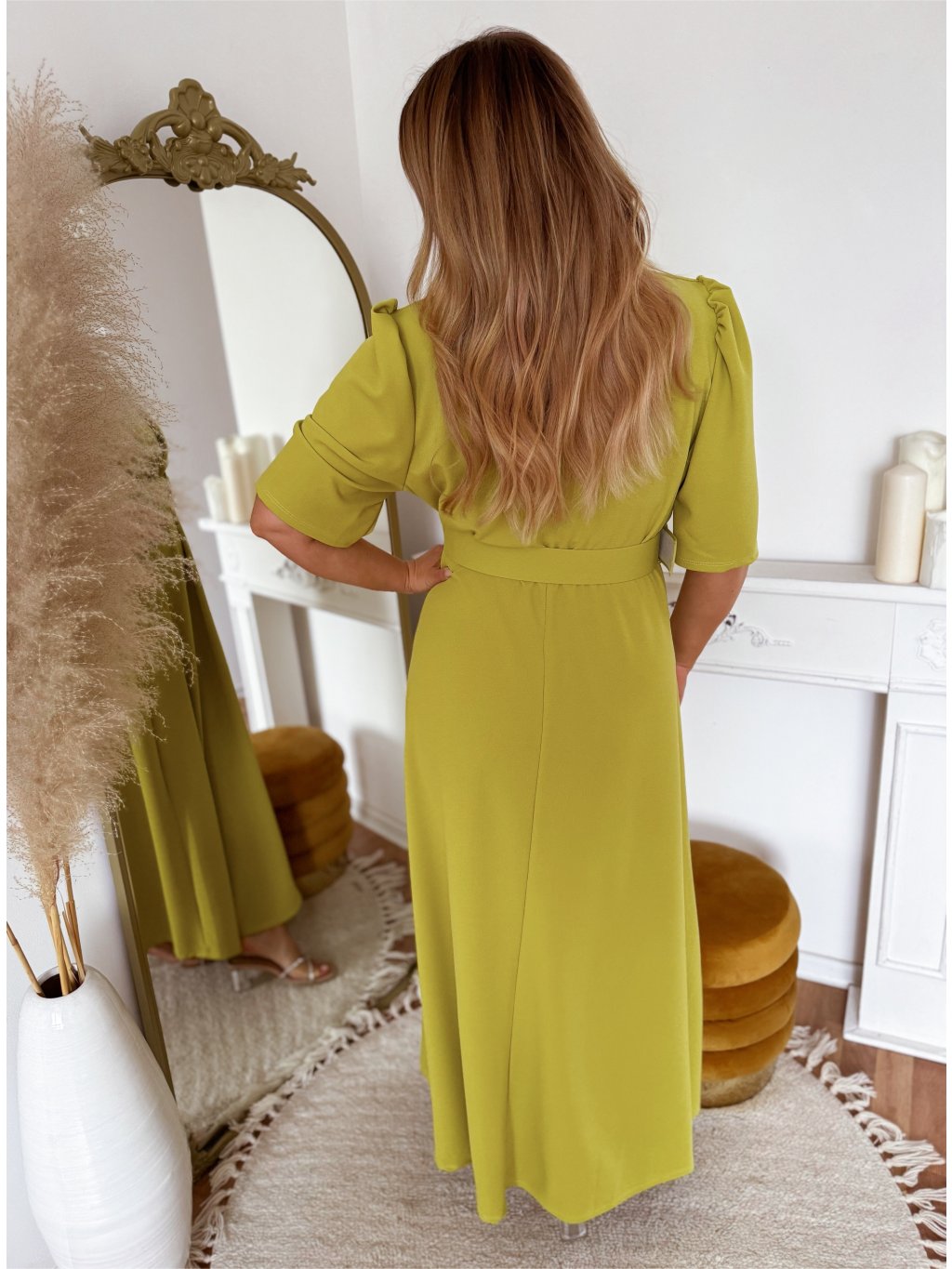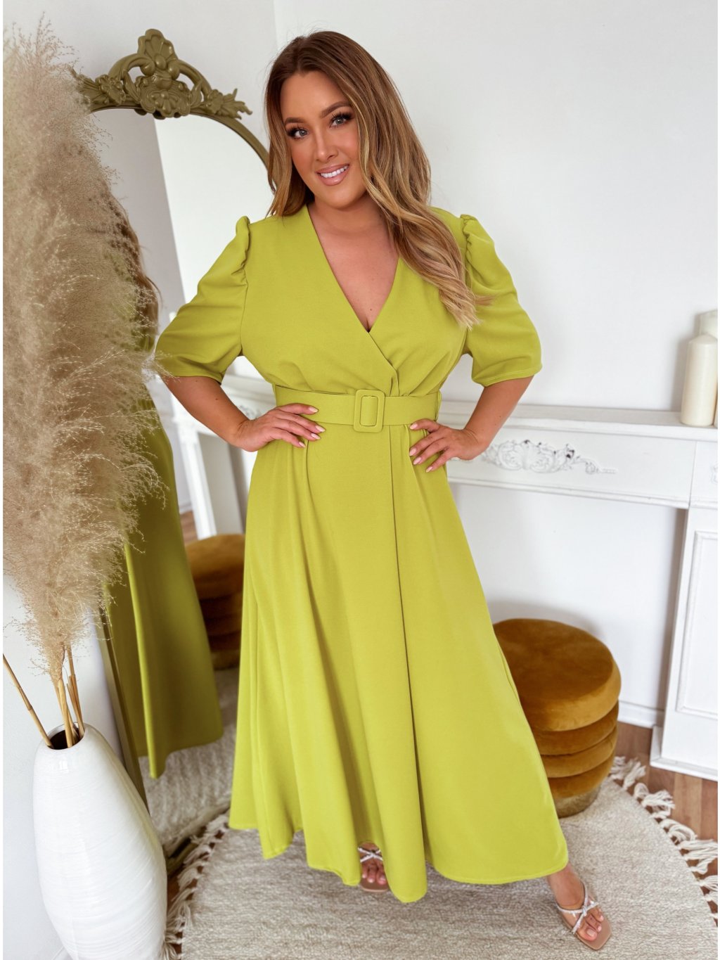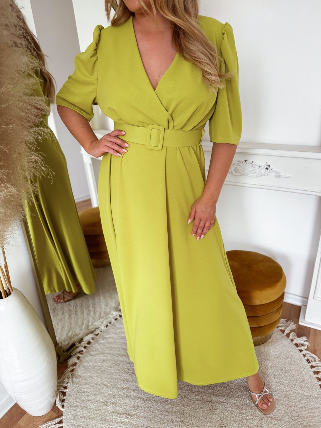 Elegáns, hosszú, limezöld, rövid ujjú, övvel ellátott ruha. A ruha laza szabású, gumírozott derékrésszel és rugalmas. A ruha XL-4XL méretekre illik. A modell 168 cm magas és univerzális méretet visel.