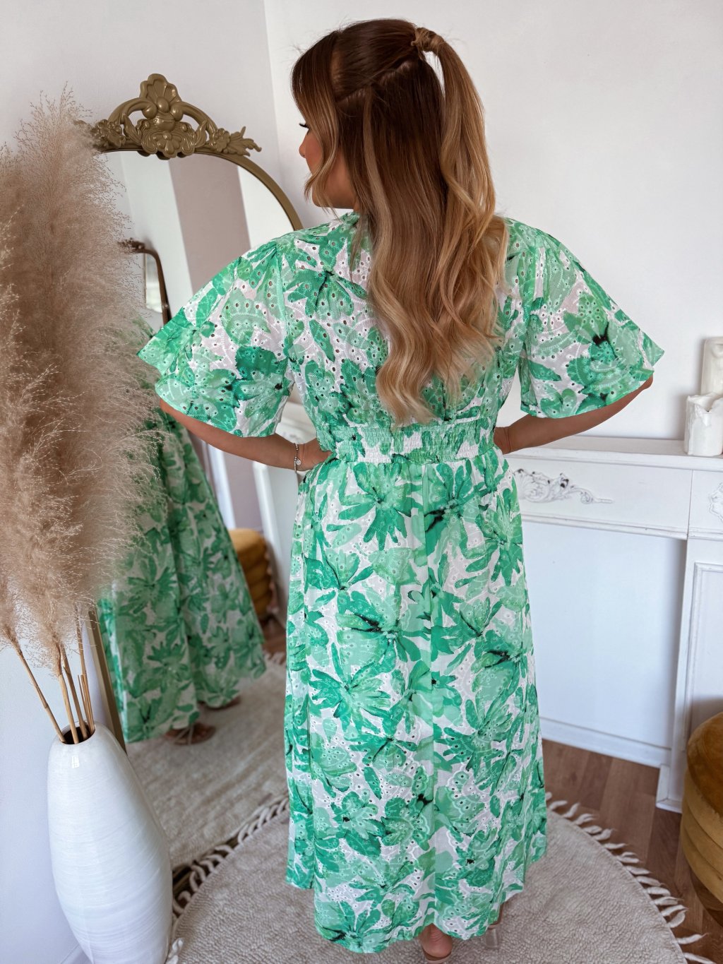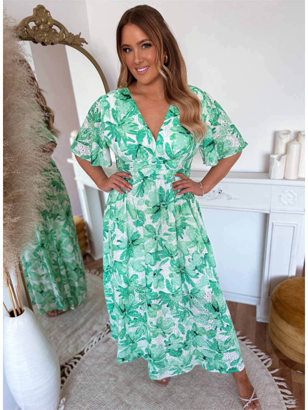 Hosszú madeira plus size ruha rövid ujjal, a ruha hátul a deréknál gumírozott, a szoknya teljesen bő szabású. A model mér 168 cm, és XL-es méretet visel.