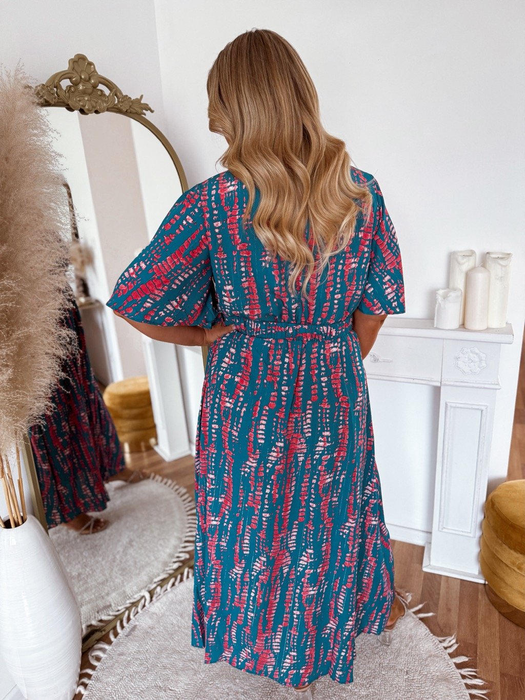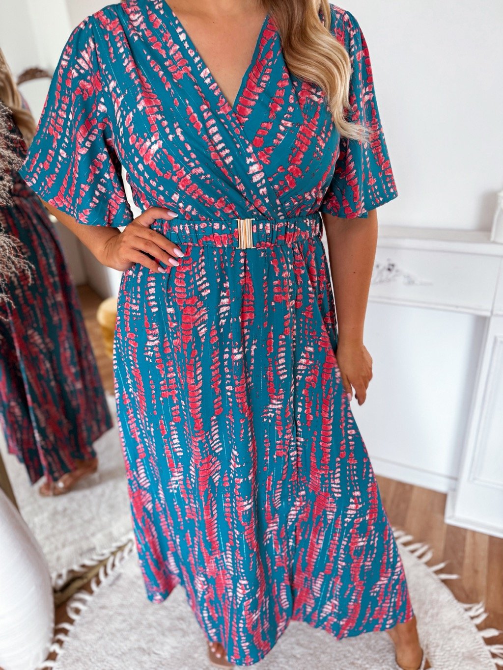 Elegáns, színes mintás, V-nyakú, karcsúsított sziluettet kiemelő övvel ellátott hosszú ruha. Ideális ünnepségekre, esküvőkre és különleges alkalmakra. A ruha derekán gumírozás található. A model mér 168 cm, és XL-es méretet visel.