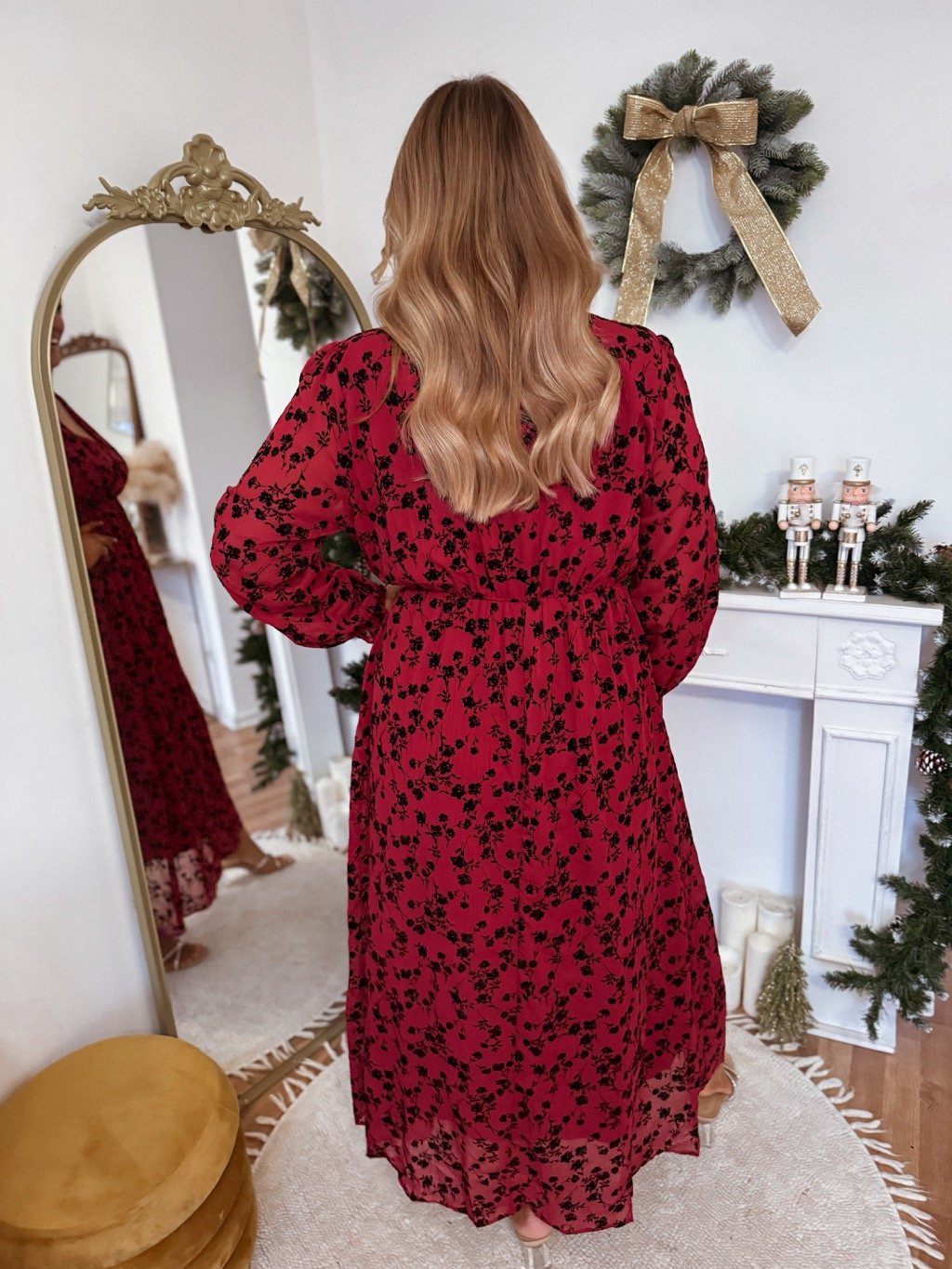 Hosszú piros ruha fekete virágmintával