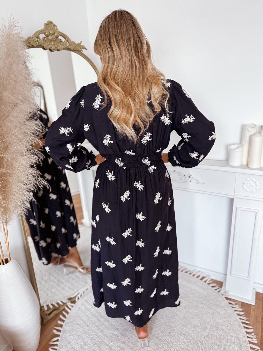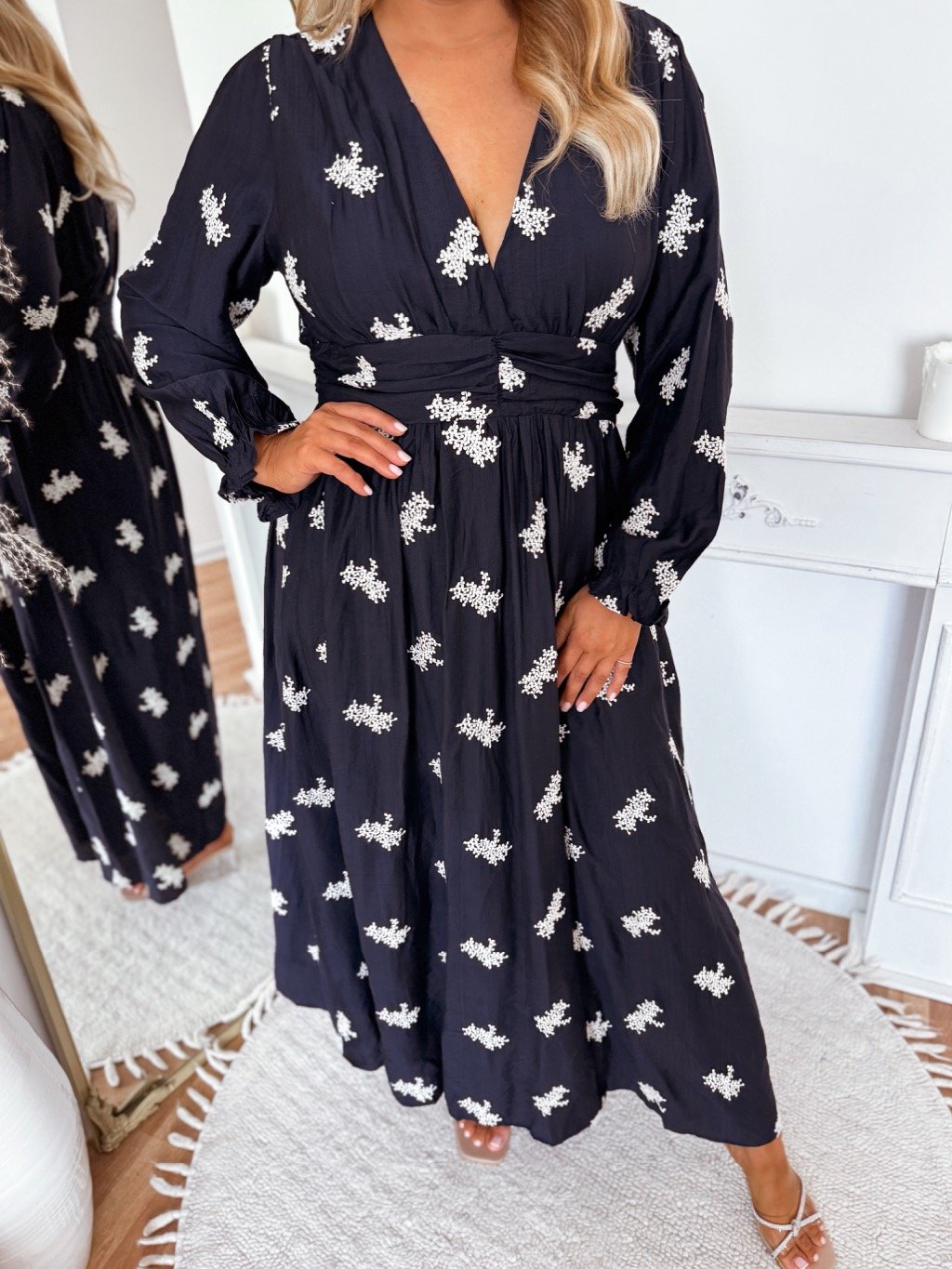 Elegáns, sötétkék női hosszú ruha, finom hímzett virágokkal díszítve. A ruha hosszú ujjakkal, V-nyakkivágással és derékban gumival rendelkezik, amely gyönyörűen kiemeli az alakot. A model mér 168 cm, és XL-es méretet visel.