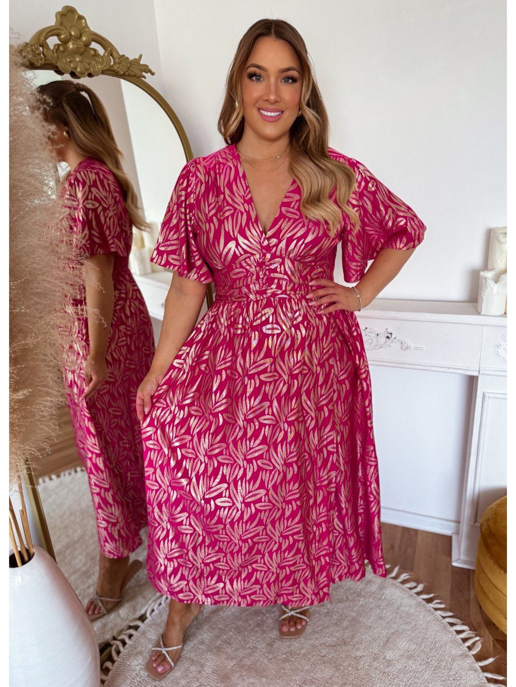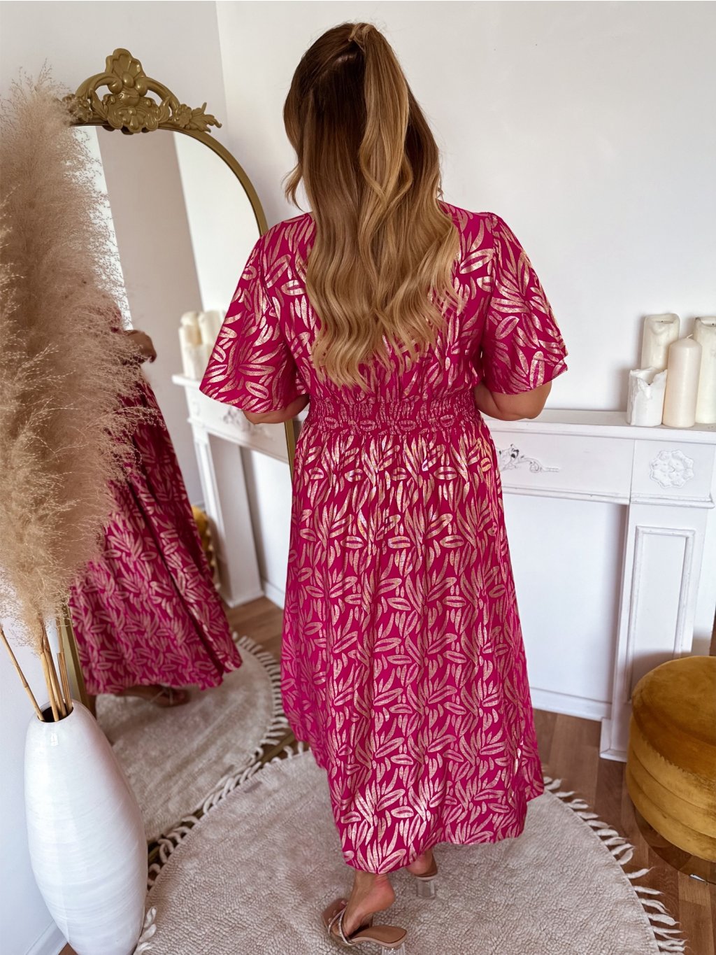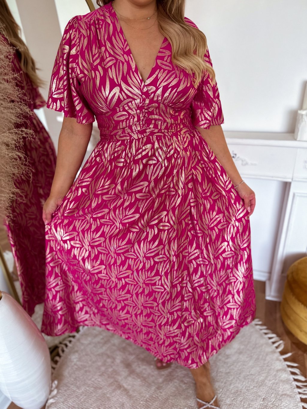 Hosszú, elegáns női ruha moletteknek, rövid ujjal és átlapolt szoknyarésszel. A ruha derekán gumírozás található. A model mér 168 cm, és XL-es méretet visel.