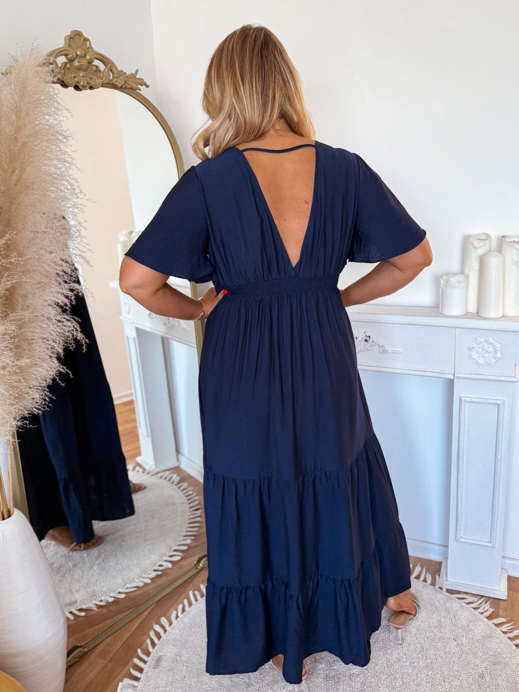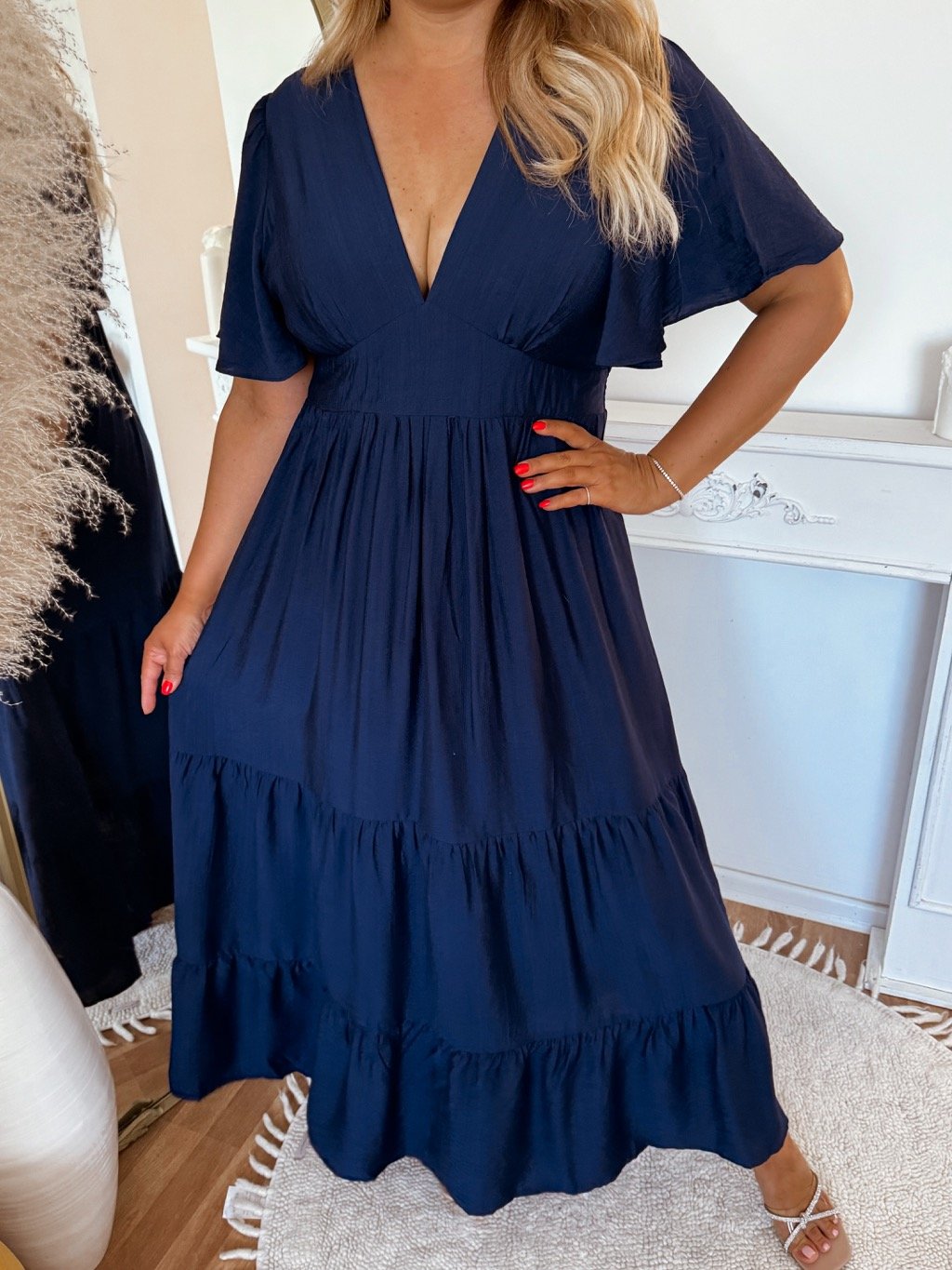 Hosszú, elegáns, sötétkék ruha molett nőknek, rövid ujjú. A ruha derekában gumírozás található, és teljesen bő szoknyája van. A model mér 168 cm, és XL-es méretet visel.