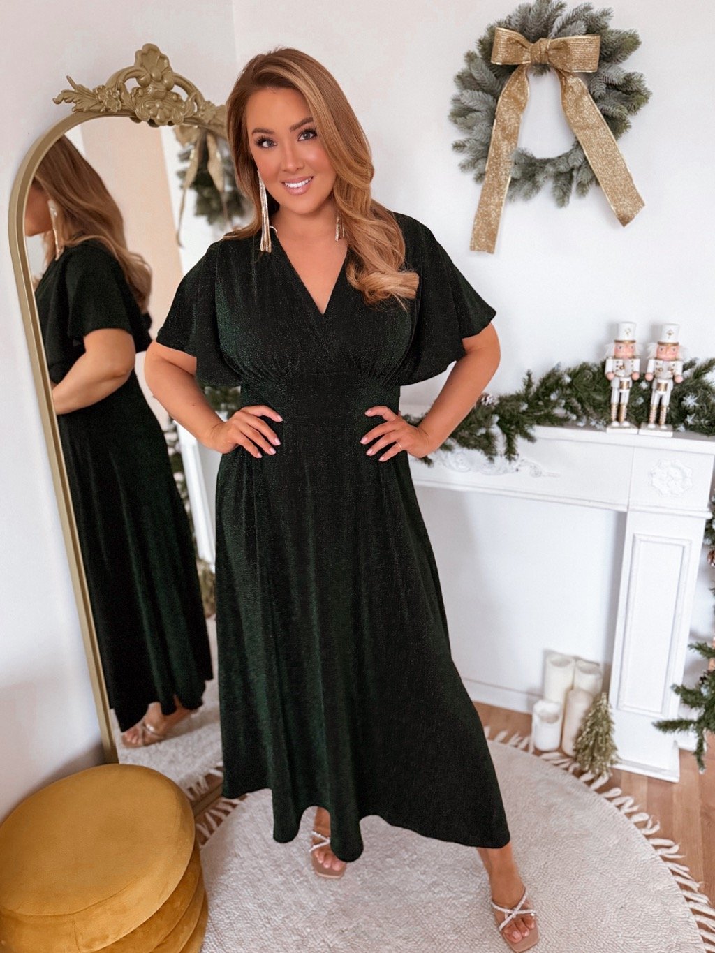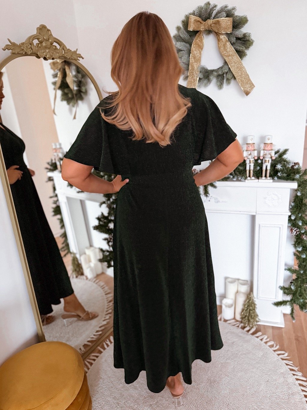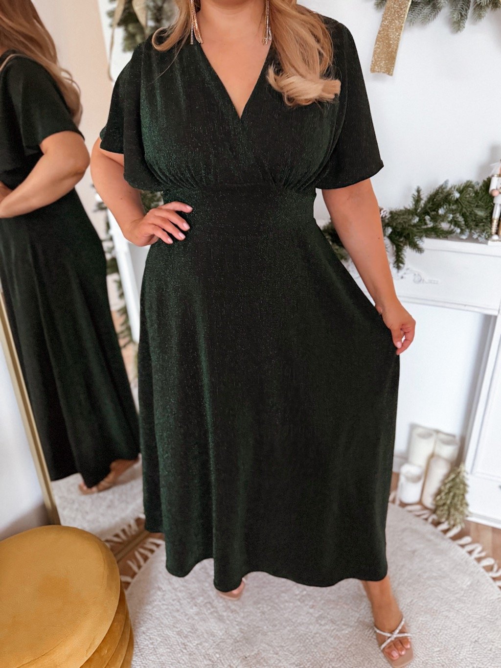 Elegáns csillogó, rövid ujjú, bő szoknyás ruha. A derékban nincs bevarrott gumipánt, a ruha azonban nagyon rugalmas, és a testen megnyúlik. A modell 168 cm magas és L/XL méretet visel.
