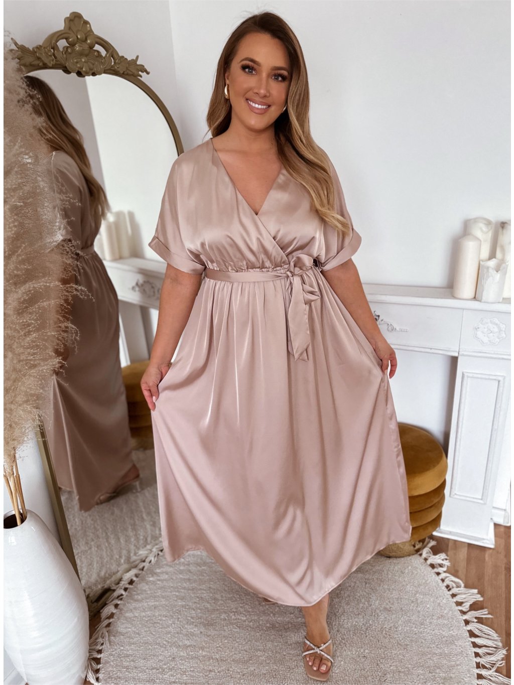 A hosszú, elegáns, szatén ruha bő szabású, és rugalmas gumiszalaggal rendelkezik a derékrészen. A model mér 168 cm, és XL-es méretet visel.