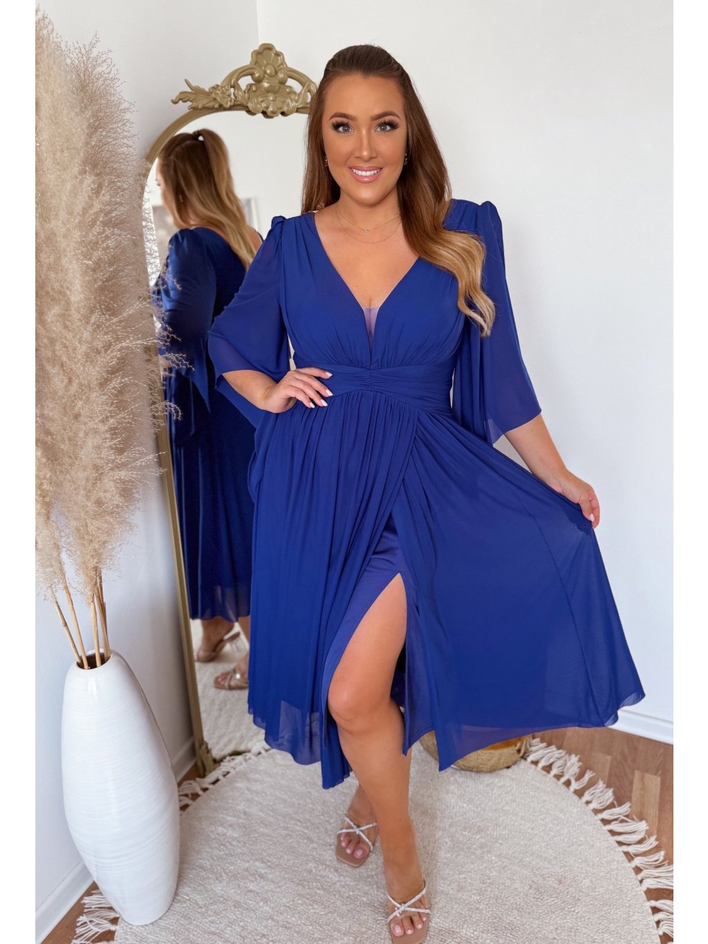 Elegáns alkalmi ruha kiemelkedő ujjas, rugalmas anyagból készült, cipzárral a hátán és finom mellbéléssel. A modell 168 cm magas és XL méretet visel.